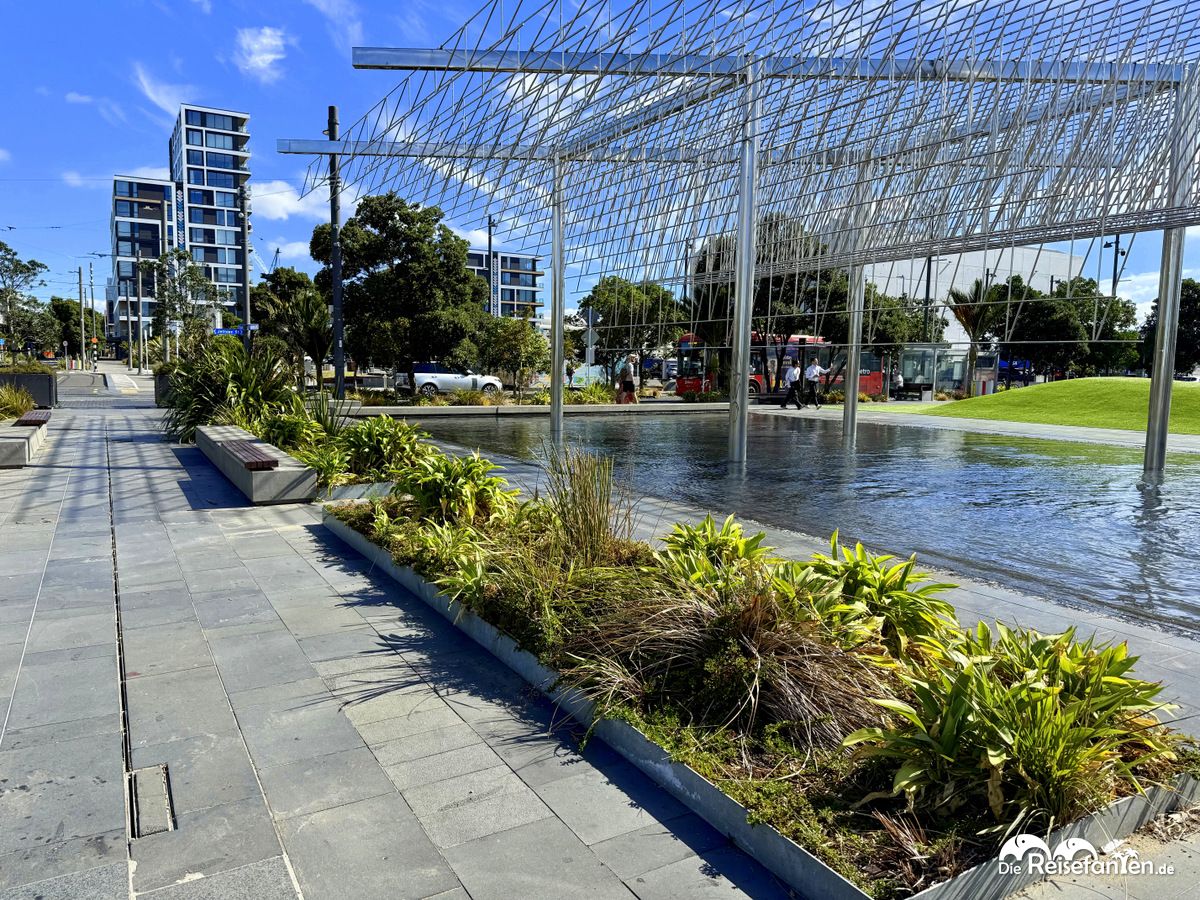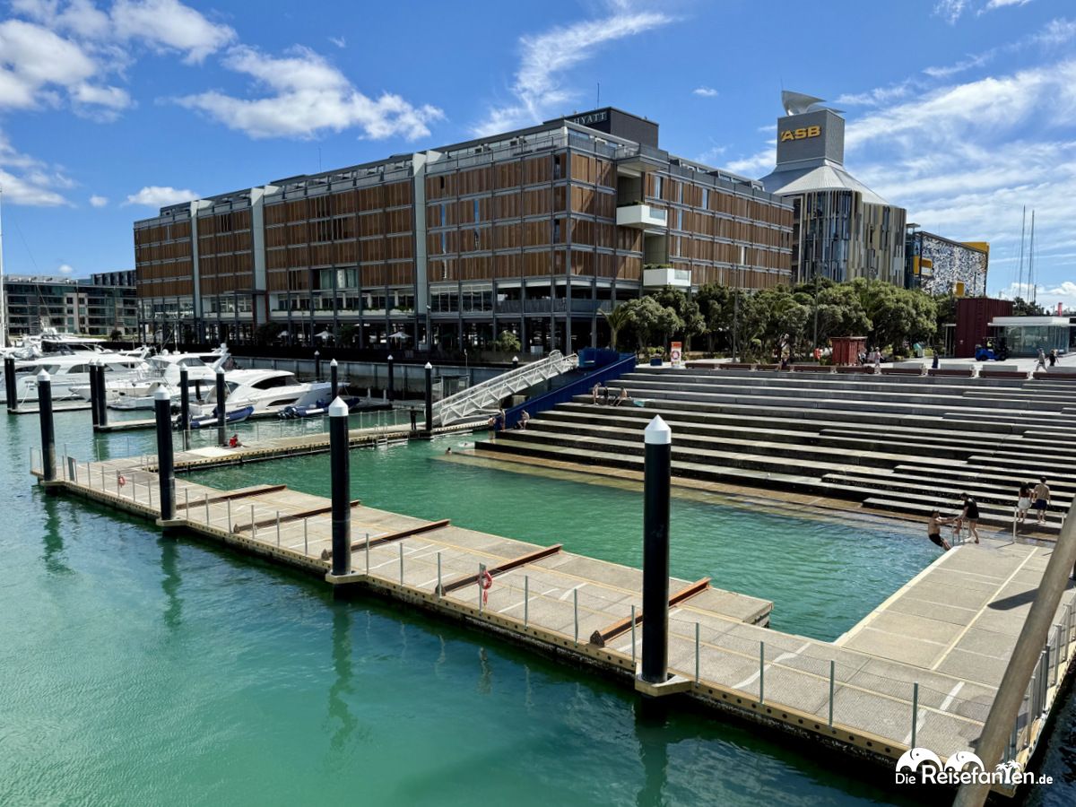 Wir setzten unsere Tour in Richtung Viaduct Harbour fort. Der Bereich erinnerte uns ein wenig an die Hamburger Hafencity aber in gewagter und moderner. Der Viaduct Harbour entstand ursprünglich als „Viaduct Basin“ für ein gescheitertes Frachthafen‑Projekt zu Beginn des 20. Jahrhunderts. Danach wurde das Becken jahrzehntelang von Fischkuttern genutzt, bis es für den America’s Cup 2000 zu einem modernen Wohn‑ und Yachthafen‑Viertel umgestaltet wurde. Es war zudem ein sehr aktiver Stadtteil mit Joggern aber auch Schwimmbecken, die für eine Abkühlung genutzt wurden. Das fanden wir richtig cool, zudem das Wasser so schön türkis aussah. Und natürlich war das Schwimmen kostenlos. Zahlreiche Sitzbänke, die in einem erstaunlich guten Zustand waren, luden zum verweilen ein. Hinzu kam der tolle Blick auf die Skyline. Die Kombination katapultierte uns in eine andere Welt. Richtig toll hier in Auckland!Auckland (14)