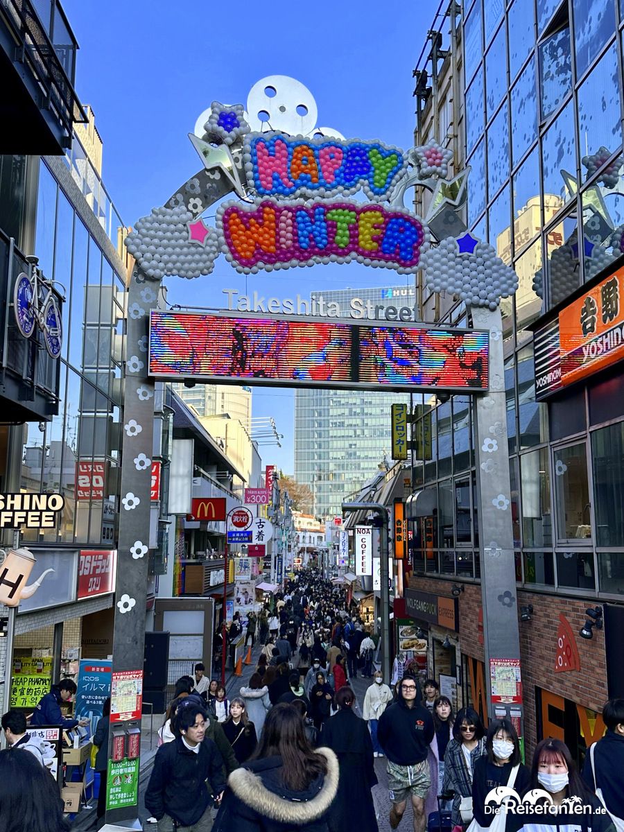Unser Weg führte uns weiter zur Takeshita Street, eine Fußgängerzone mit alternativen und Second Hand Geschäften, die vor allem bei jüngeren Leuten beliebt zu sein scheinen. Zudem gibt es dort aber auch viele Snacks zu kaufen, vor allem Crêpes und Süßigkeiten. Wir konnten der Versuchung auch nicht widerstehen und gönnten uns ein Matcha Crêpe, welches sehr lecker war. Dabei konnte man schön in Umgebung beobachten. 🙂