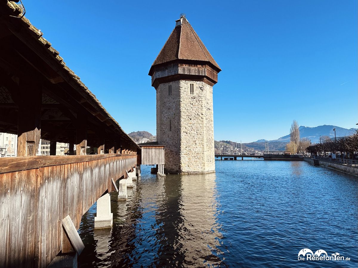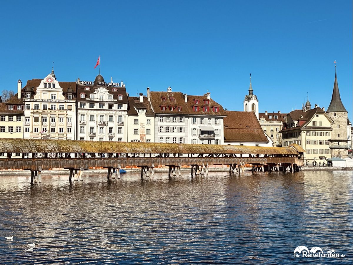 Die Kapellbrücke, ein ikonisches Wahrzeichen, ist eine der ältesten Holzbrücken Europas und ein beliebtes Fotomotiv. Vom Bahnhof kamen wir hier als Erstes vorbei und natürlich machten auch wir zahlreiche Fotos. Im Sommer ist die Brücke schön bepflanzt, da müssen wir unbedingt nochmal wiederkommen.