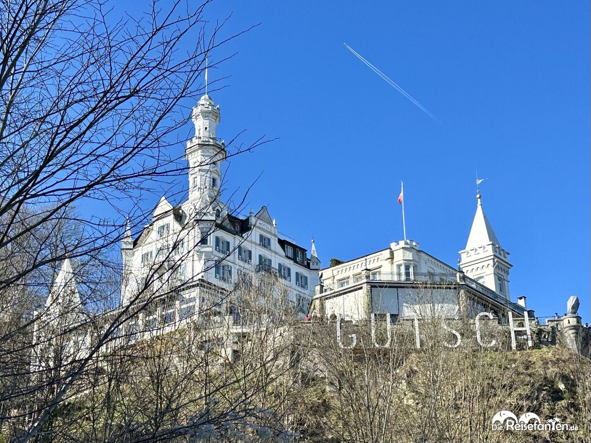 Luzern (9)Einen tollen Ausblick auf Luzern hat man vom Gütsch, der eine atemberaubende Aussicht auf die Stadt, den Vierwaldstättersee und die umliegenden Berge bietet. Auf dem Gütsch befindet sich das gleichnamige Hotel Gütsch, das im 19. Jahrhundert erbaut wurde. Wir brauchten rund 30 Minuten vom Stadtzentrum, bis wir den Gipfel erreichten. Alternativ gibt es auch eine Seilbahn, man kann den Weg aber auch gut laufen. Der Ausblick lohnt sich!