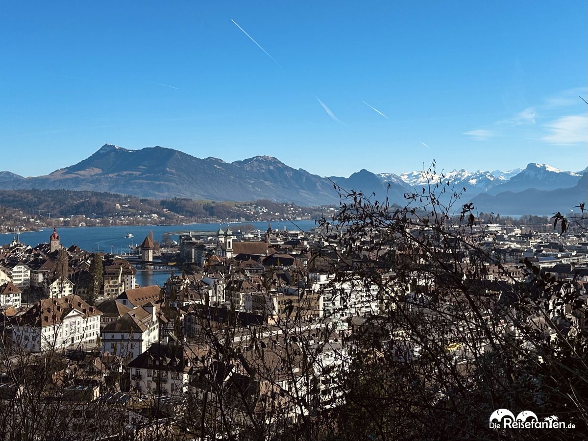 Einen tollen Ausblick auf Luzern hat man vom Gütsch, der eine atemberaubende Aussicht auf die Stadt, den Vierwaldstättersee und die umliegenden Berge bietet. Auf dem Gütsch befindet sich das gleichnamige Hotel Gütsch, das im 19. Jahrhundert erbaut wurde. Wir brauchten rund 30 Minuten vom Stadtzentrum, bis wir den Gipfel erreichten. Alternativ gibt es auch eine Seilbahn, man kann den Weg aber auch gut laufen. Der Ausblick lohnt sich!