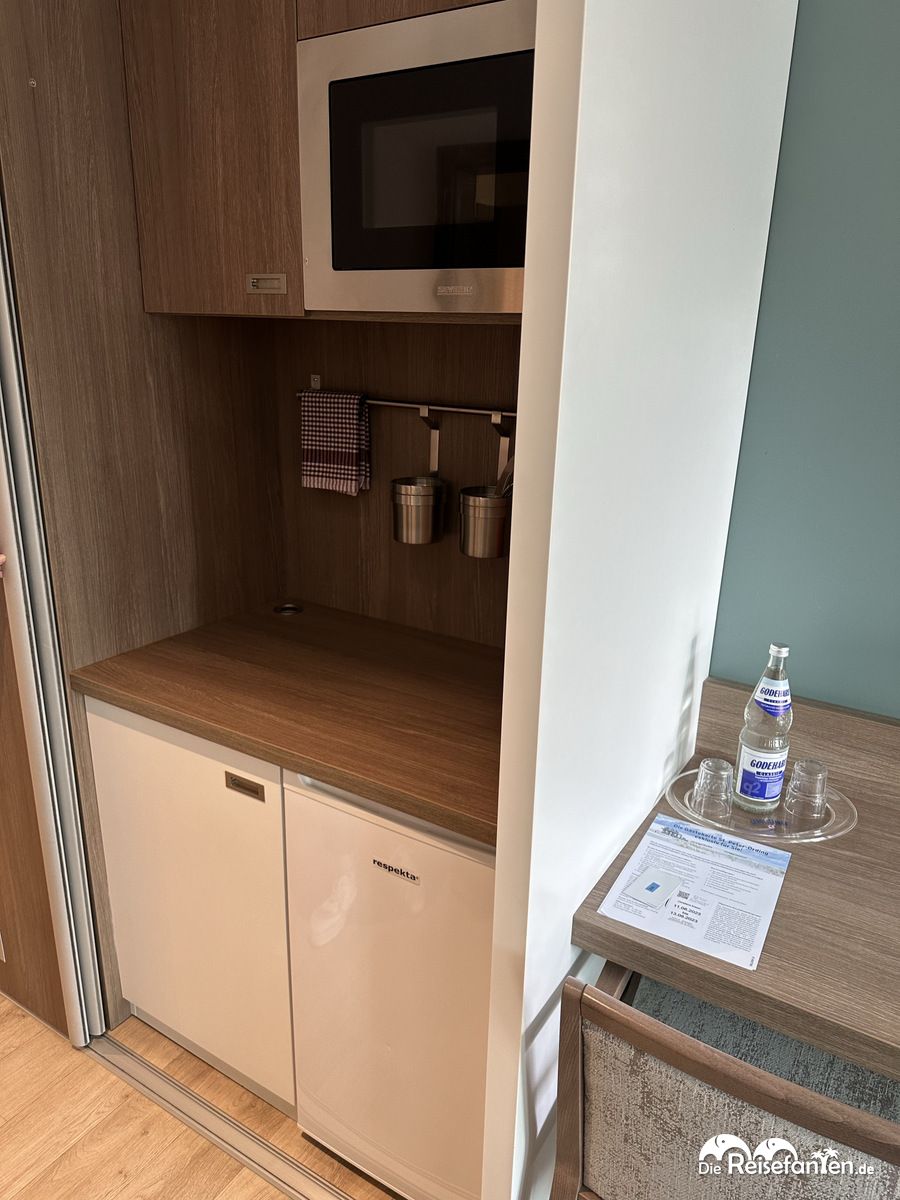 Eine kleine Küchenzeile gehört ebenfalls zur Ausstattung des Zimmers, verbaut ist dort praktischerweise auch ein Kühlschrank. Mit Mineralwasser wurden wir ebenfalls versorgt, das sollte in unseren Augen in dieser Hotelkategorie allerdings auch Standard sein.