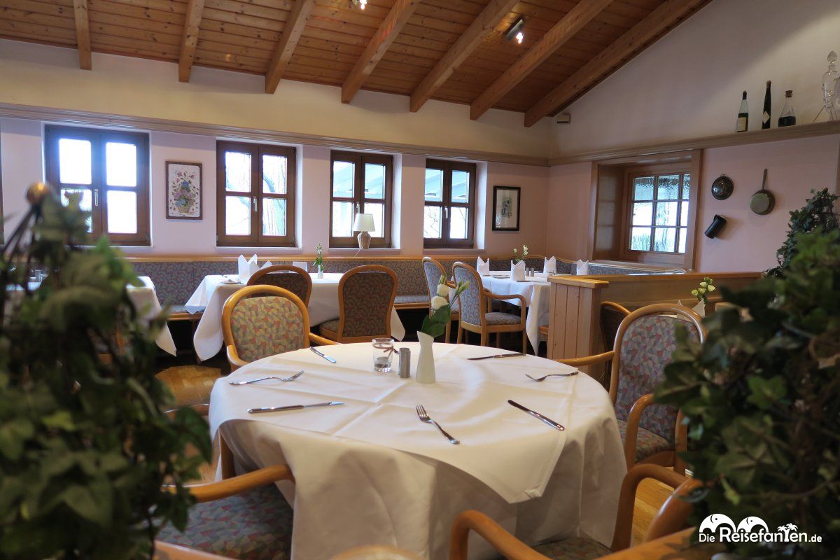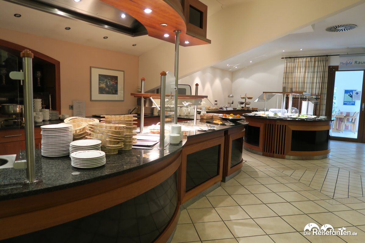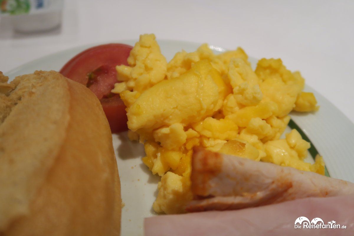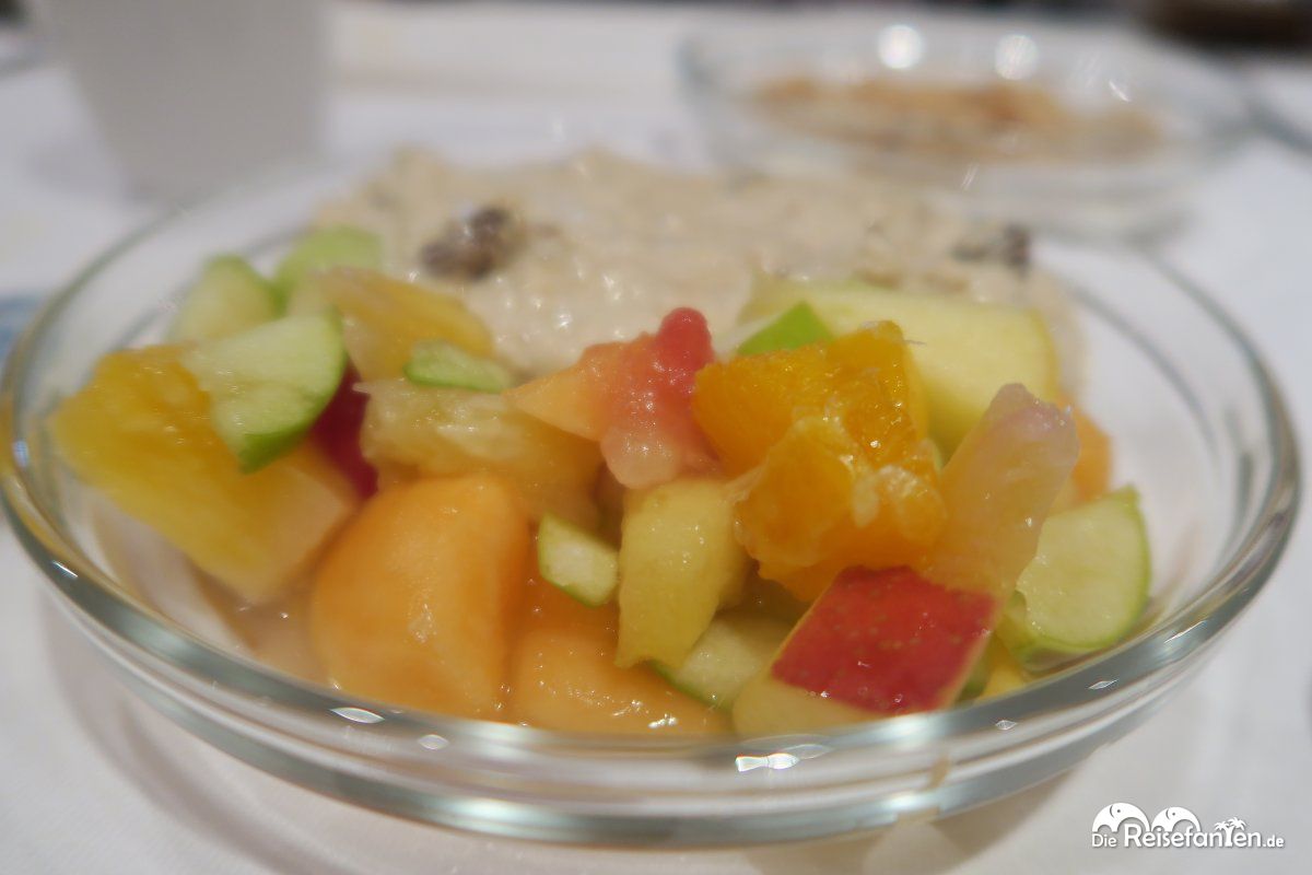 Das Frühstück gab es am nächsten Morgen von 8 bis 11 Uhr im Nebengebäude, was aber durch einen Gang trockenen Fußes erreichbar war. Die eine anwesende Servicekraft räumte zwar fleißig die Tische ab, eine Begrüßung blieb sie aber schuldig und nachgelegt wurde leider auch nicht mehr. Der Kaffee war – obwohl in Selbstbedienung aus dem Automaten – erstaunlich lecker, das Birchermüsli und der Fruchtsalat ebenso.