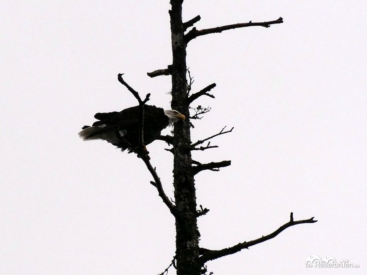 Tongass – Sea People – da fuhren wir entlang und Norm zeigte uns auf der Tour diverse Punkte, erzählte viel über Landschaft, Geschichte und Tierwelt – auch über lokale Kuriositäten wie einem Millionär aus Hawaii, der sich dort ein Haus in den Fels sprengte und es seitdem nicht ein einziges Mal genutzt hat. Einige der Totems vor Ort verrotten auch im Freien und werden einfach mangels finanzieller Mittel nicht mehr instandgesetzt. Einen Weißkopfseeadler sahen wir auch am Straßenrand – auch hier stiegen wir als einzige aus, die Asiaten machten noch nicht einmal Anstalten, es uns gleich zu tun. Auch am nächsten Haltepunkt waren nur Möwen und keine Bären zu sehen – die mochten dieses Wetter nämlich nicht, sehr zum Leidwesen der Asiaten.