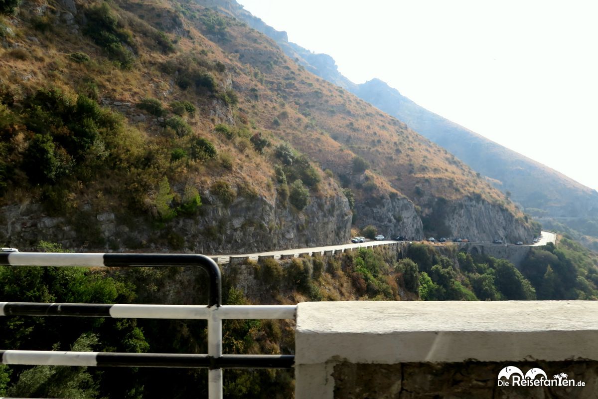 Blick von der Amalfitana auf die KüsteDie berühmte Küstenstraße führte uns bis Amalfi. Von unserem Hotel in Sorrento brachen wir schon am frühen Morgen auf. Wir haben zunächst überlegt, die Amalfitana komplett zu meiden, da von langen Staus die Rede war. Letztendlich übernahm aber unser Navi die Entscheidung und lotste uns die Amalfitana entlang. Später als um 8h sollte man nicht aufbrechen, um die Fahrt genießen zu können. Gerade in der Sommersaison sowie an den Wochenenden sind zahlreiche Touristen unterwegs. Die Straße selbst ist dermaßen eng und voll, dass mitunter rangiert werden muss. Wir hatten sehr viel Glück und konnten entspannt die Amalfitana im Juli entlang fahren – gerade weil wir so früh aufgebrochen sind.