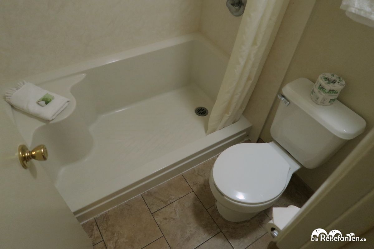 Schlafzimmer und Eingangstür in der Red Feather Lodge am Grand CanyonUnser Zimmer war einfach, aber erfüllte seinen Zweck vollkommen. Wir kamen nach unserer langen Fahrt vom Joshua Tree Nationalpark über Amboy und Oatman recht spät in der Red Feather Lodge an und folglich haben wir von der Unterkunft eh nicht sonderlich viel gehabt – die gute Dusche, einen Kaffee und das bequeme Bett mal außen vor gelassen. Die Lage spricht natürlich für sich – für einen frühen Start zur Mutter aller Canyons liegt die Lodge wirklich ideal und dank der amerikatypischen Fastfood-Ketten konnten wir auch ein unkompliziertes, schnelles Frühstück gegenüber genießen – das hatten wir in der Red Feather Lodge nämlich nicht mit dazugebucht.