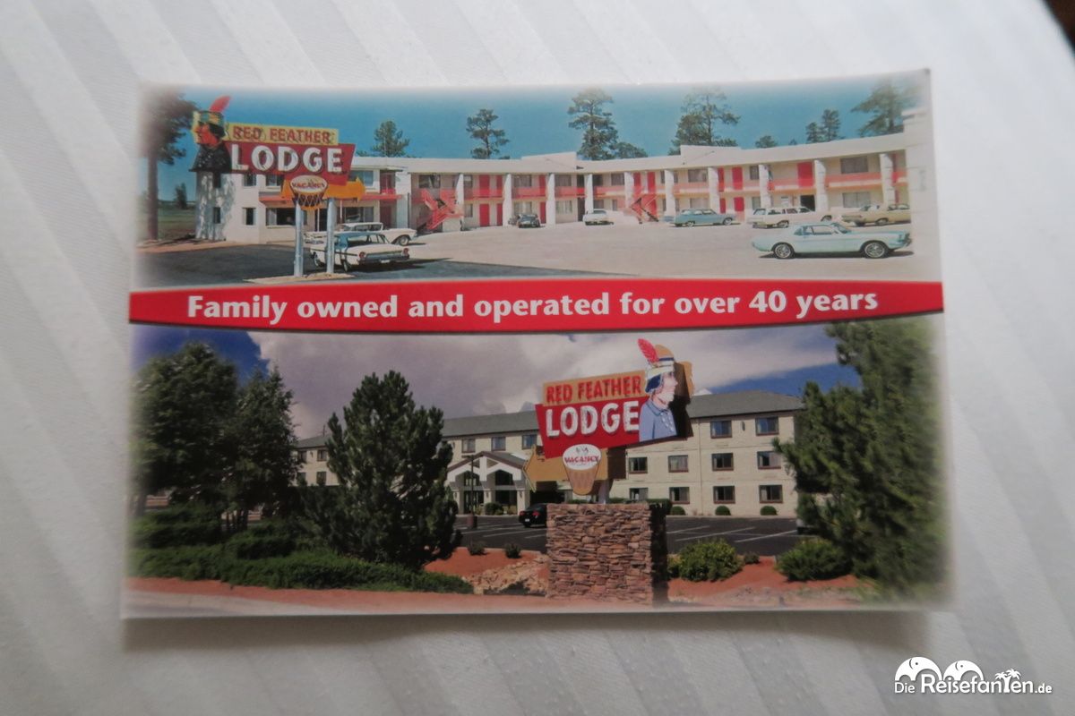 In dem kleinen Städtchen Tusayan, nahe des Südrands des Grand Canyon, liegt die Red Feather Lodge. In dem schon seit 1964 erbauten Hotelkomplex gibt es insgesamt zwei Gebäudeteile, je nach gebuchter Variante. Kurz vor unserem Besuch des Grand Canyon, nach der Fahrt von Oatman übernachteten wir gut eine Meile vom südlichen Rand entfernt in der Red Feather Lodge.