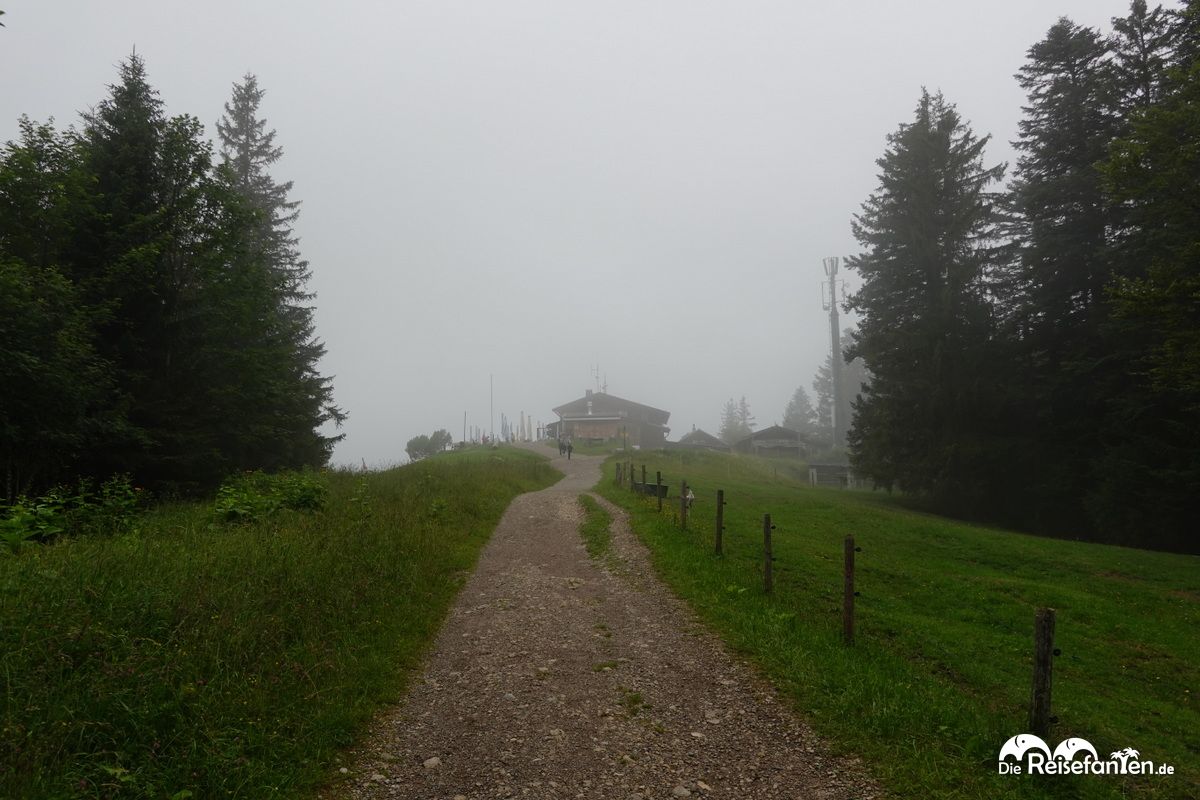 Oben angekommen, wurden wir mit einer spektakulären Aussicht belohnt – nicht. Es war eine weiße Wand, nur Nebel, als säße man mitten in einer Wolke, was es eigentlich auch war. In Gedanken schauten wir über das Tegernseer Tal, das Mangfallgebirge und die Zillertaler Alpen – aber nur Wolken spannten sich vor unseren Augen. Die Neureuth war dennoch gut besucht. Wir probierten den hausgemachten Kaiserschmarrn – ein Kalorien- und Geschmackserlebnis, das wir nicht so schnell vergessen werden. Zum Glück teilten wir uns eine der großen Portionen.