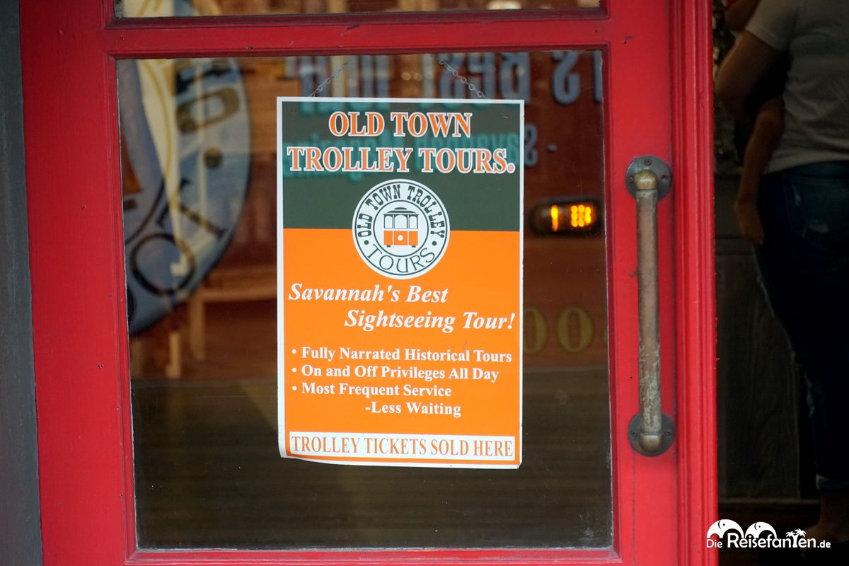 Die Firma Old Town Trolley Tours bietet seit über 30 Jahren Besichtigungstouren durch Savannah an und bedient sich traditioneller Trolleys, bei denen man eine spannende Mischung aus Transport und Unterhaltung erleben kann. Dem „Hop on Hop off“ Konzept folgend lässt sich hier bequem die Stadt erkunden und das alles noch mit Live-Audio der Guides an Bord.