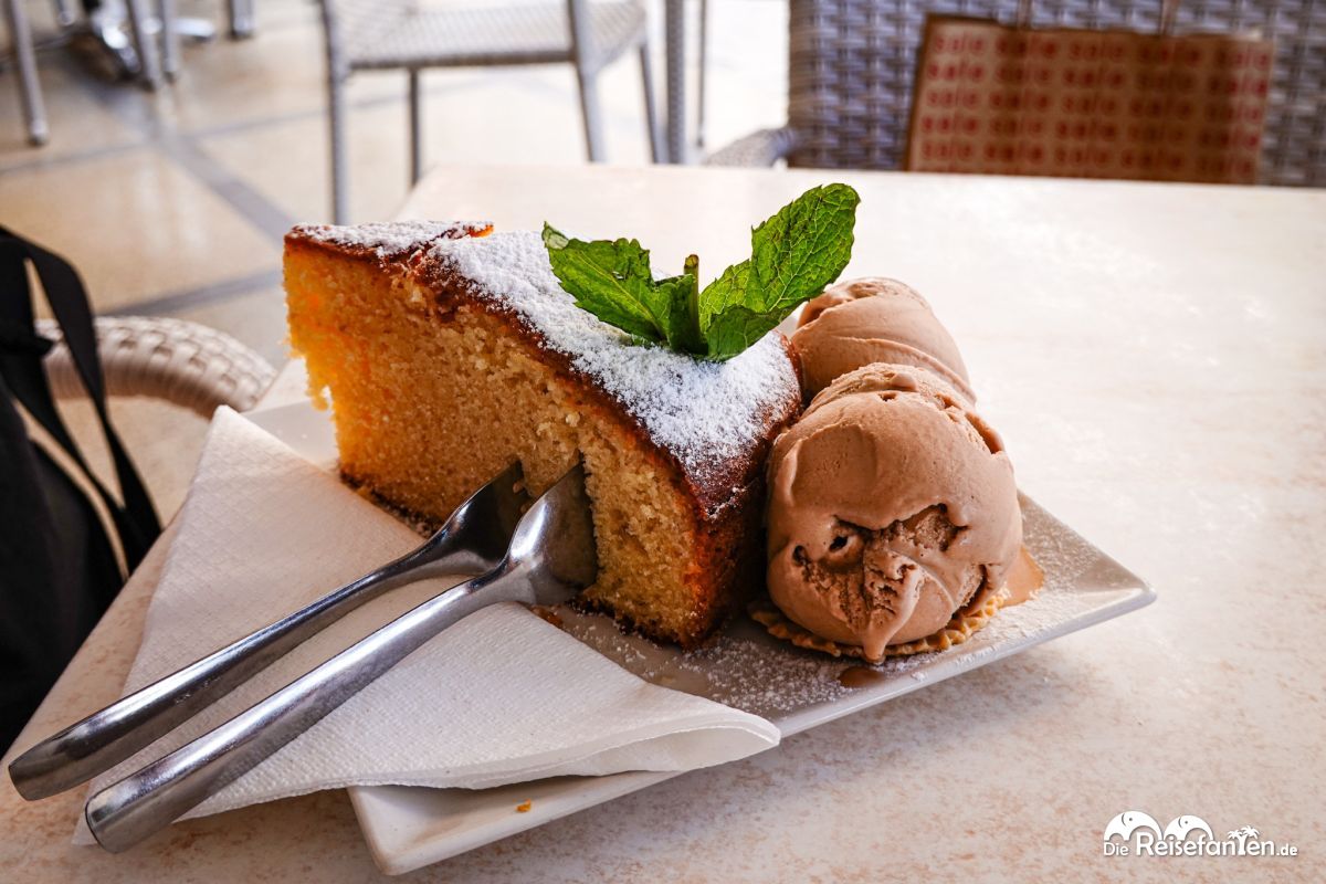 Nach dem Bummeln und Schlendern auf dem Markt ging’s weiter nach Cala Millor. Die lange Bucht mit ihrem glasklaren Wasser und der gepflegten Promenade war einfach traumhaft. Wir schlenderten am Wasser entlang, genossen den Blick auf das türkisfarbene Meer und die feinen Sandstrände. Besonders gefallen hat uns, wie lebendig und doch entspannt dieser Ort wirkt. Beim Spazieren fiel uns auf, dass hier jede Menge Restaurants, Bars und kleine Läden lockten – perfekt, um einfach die Seele baumeln zu lassen. Zwischendurch haben wir in einem kleinen Café im Schatten einen mallorquinischen Mandelkuchen, den Gato Mallorquin, genossen. Warm, süß, dazu noch zwei Kugeln Haselnusseis – einfach zum Verlieben. Ein echtes Geschmackserlebnis, das unsere Reise noch süßer gemacht hat.