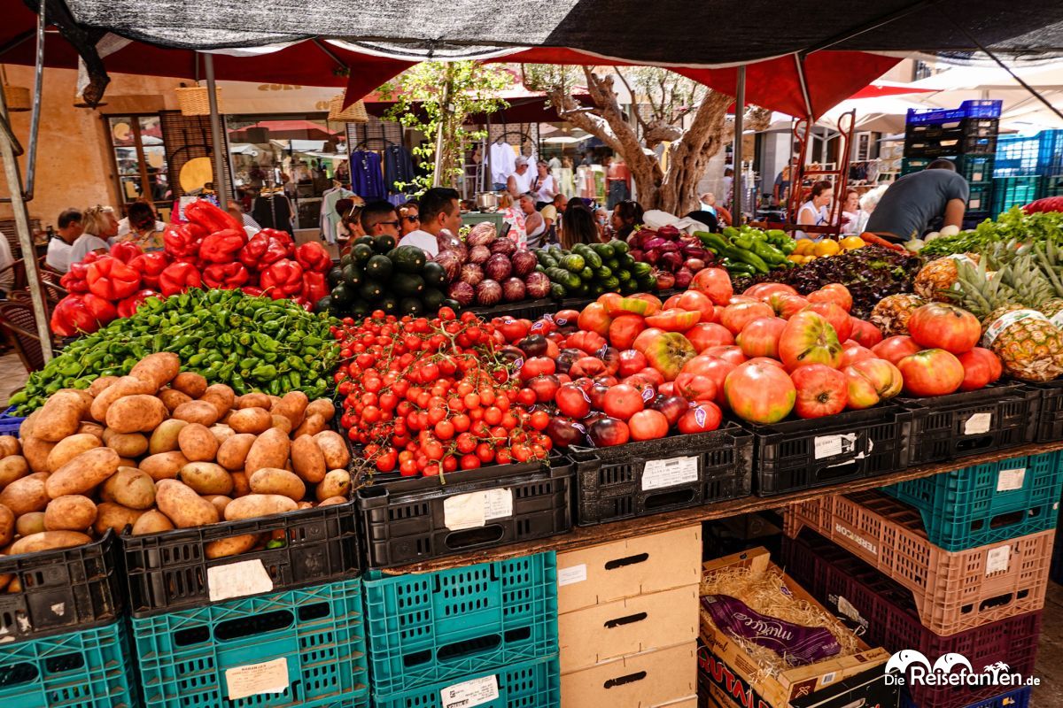 Das Sortiment war beeindruckend: Frisches Obst und Gemüse, lokale Spezialitäten, Kunsthandwerk, Kleidung, Schmuck, Lederwaren, Blumen und sogar Antiquitäten – hier gab’s alles, was das Herz begehrt. Das Ambiente wurde durch die vielen Cafés, Bars und Restaurants in der Nähe noch verstärkt, so dass wir quasi mitten im mallorquinischen Leben standen. Viele regionale Künstler und Designer boten ihre Produkte an, was den Markt noch lebendiger machte. Das Ganze hatte eine super stimmungsvolle, charmante Atmosphäre, die uns sofort in Urlaubslaune versetzt hat. Wer den Markt entspannt erleben wollte, sollte möglichst früh kommen, denn ab Mittag wurde es schnell voll – am besten lässt man das Auto lieber am Ortsrand stehen und schlendert ruhig durch die Gassen.
