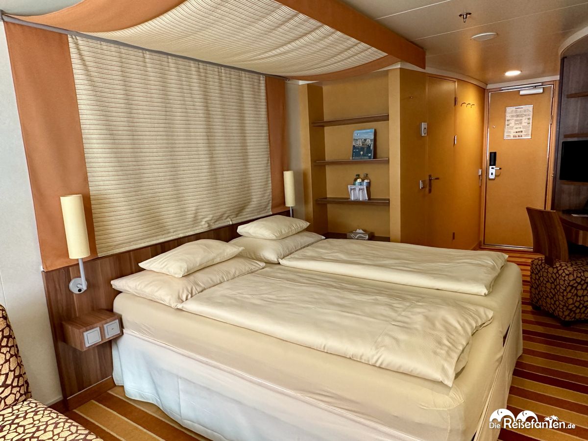 Anders als bei der ersten Reise, wo wir eine Balkonkabine bewohnten, buchten wir dieses Mal eine Außenkabine. Gerne wären wir erneut in einer Balkonkabine untergekommen aber das war aussichtslos, es war alles ausgebucht. Bedingt durch Corona fanden die ersten Asienreise Seitens AIDA in der Saison 2024 statt und so hatten noch viele Reisende Buchungen, die sie seit der Coronazeit verschoben. Die Fahrt war ausgebucht und wir waren froh, mit an Bord zu sein. Unsere Außenkabine war soweit auch in Ordnung. Da wir nicht jeden Tag über 30 Grad hatten und auch kühlere Seetage dabei waren, vermissten wir den Balkon eigentlich nur in Bezug auf die Frischluftzufuhr.