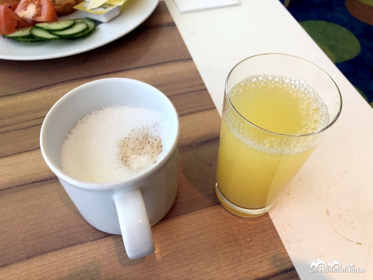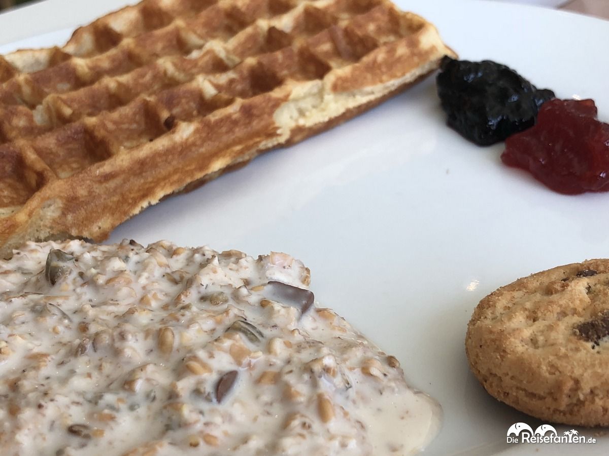 Essenstechnisch fanden wir dabei alles für ein gelungenes Frühstück vor. Herzhafte Spiegeleier, Pilze, Röstitaler und Grilltomaten luden ein, dazu diverse Käsesorten, aber auch an die süßen Frühstücker war gedacht. Von Birchermüsli über Pfannkuchen, manchmal Waffeln und auch mal das ein oder andere süße Teilchen waren vorhanden. Getränketechnisch gab es neben diversen Tee- und Kaffeesorten auch Orangensaft und Milch.