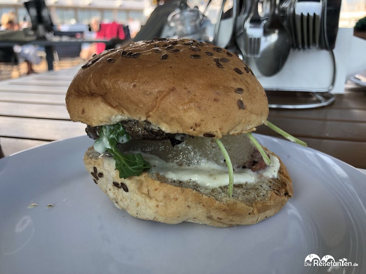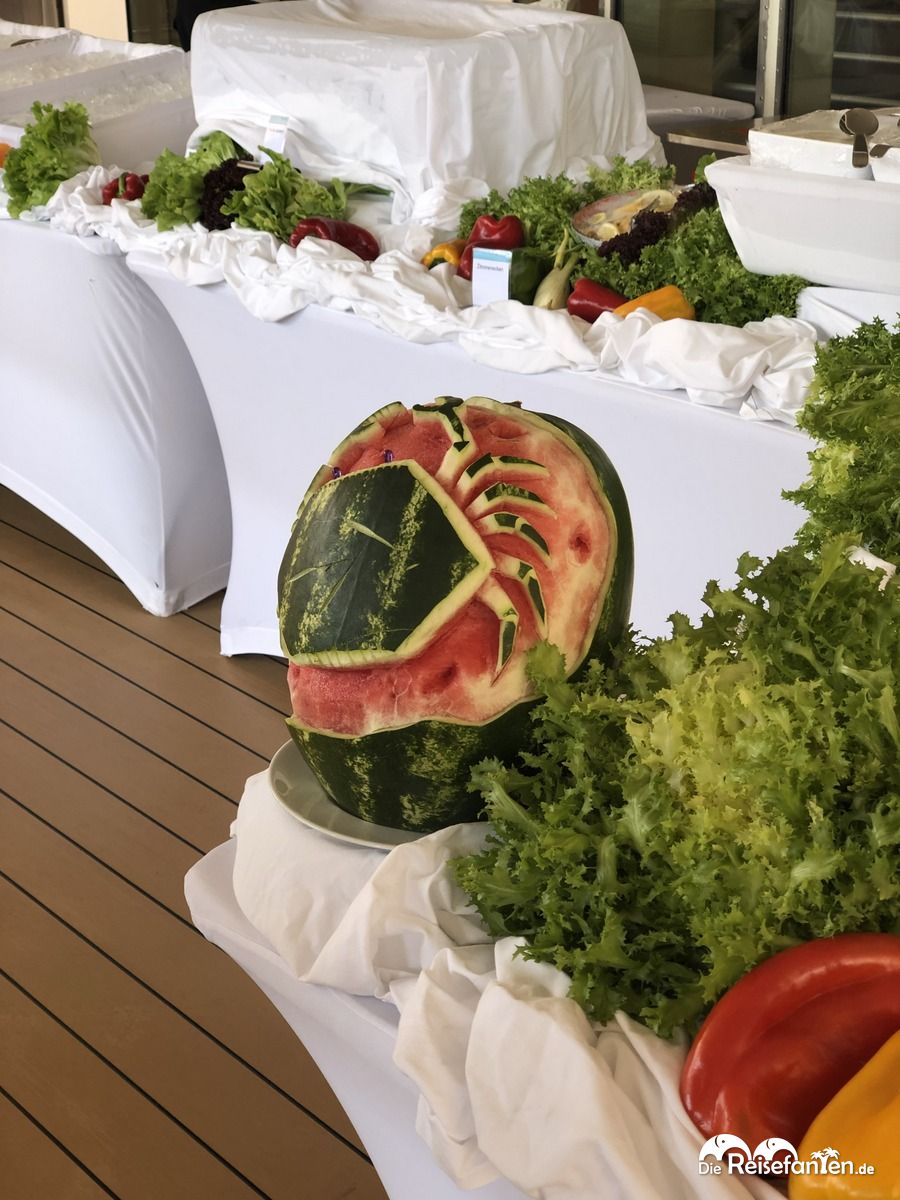 Wir waren wahrlich nicht oft über die Mittagszeit an Bord des Schiffes, aber wenn, wurde meist ein Lunchbuffet am Pooldeck (inkl. Melonenschnitzereien) aufgebaut, wo es leichte Speisen wie Salate, Fisch und Baguette gab. Wer mochte, konnte sich aber auch ein Panino oder Burger ergattern, einmal wurde als Aktion sogar Currywurst angeboten.