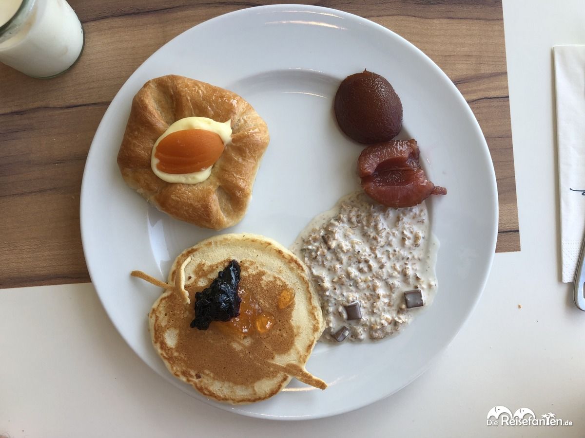 Essenstechnisch fanden wir dabei alles für ein gelungenes Frühstück vor. Herzhafte Spiegeleier, Pilze, Röstitaler und Grilltomaten luden ein, dazu diverse Käsesorten, aber auch an die süßen Frühstücker war gedacht. Von Birchermüsli über Pfannkuchen, manchmal Waffeln und auch mal das ein oder andere süße Teilchen waren vorhanden. Getränketechnisch gab es neben diversen Tee- und Kaffeesorten auch Orangensaft und Milch.