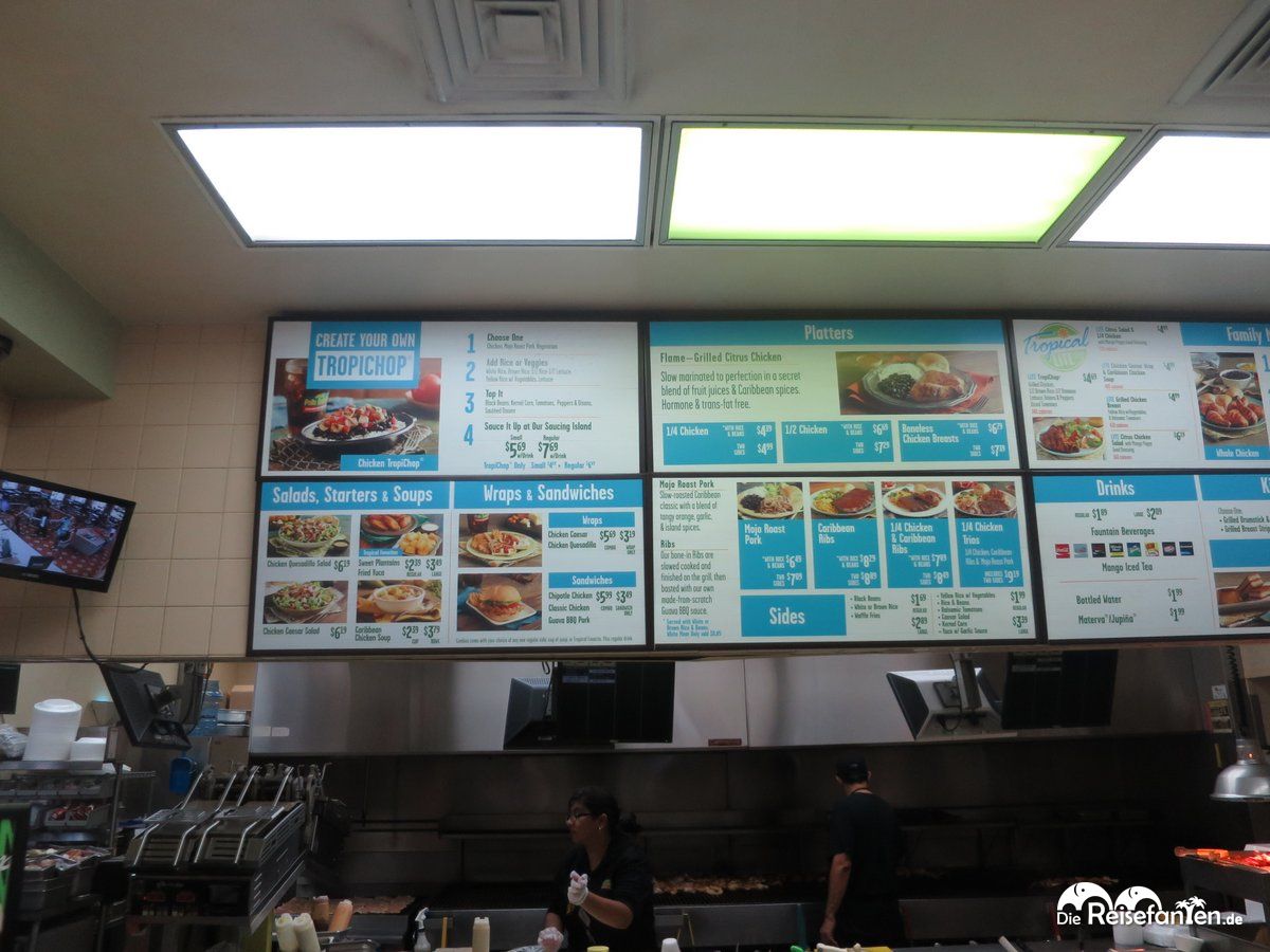 Eine andere Geschmacksrichtung gibt es im Pollo Tropical, einer Kette, die vor allem in Florida recht weit verbreitet ist, mit gut 180 Filialen insgesamt aber Taco Bell noch nicht das Wasser reichen kann. Hier gibt es hauptsächlich karibische Küche, also viel Hähnchen, schwarze Bohnen, gelben Reis, Gemüse und geriffelte Pommes Frites. Dazu gibt es eine umfangreiche Selbstbedienungsstation, an der man sich nach Herzenslust noch Salat und Soßen ohne Ende nachnehmen kann. Besonders die Soßen haben es uns dabei sehr angetan – von süßer Mangosoße bis zu scharfen Kandidaten war alles dabei. Das Essen wirkte zudem sehr frisch, das Hähnchen war lecker zubereitet und kein Vergleich zu sonstigen Arten von Press- und Formfleisch, das man in manch anderen Ketten so vorgesetzt bekommt.