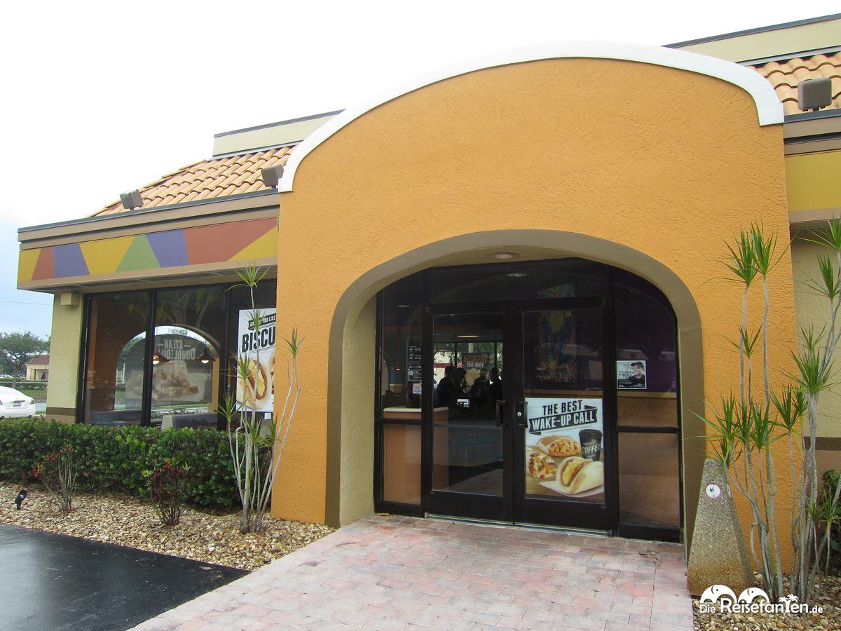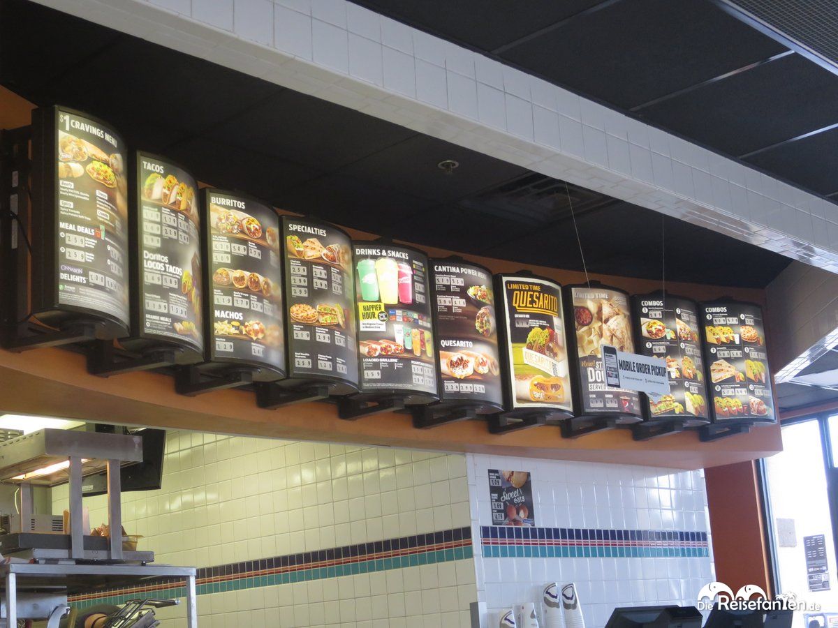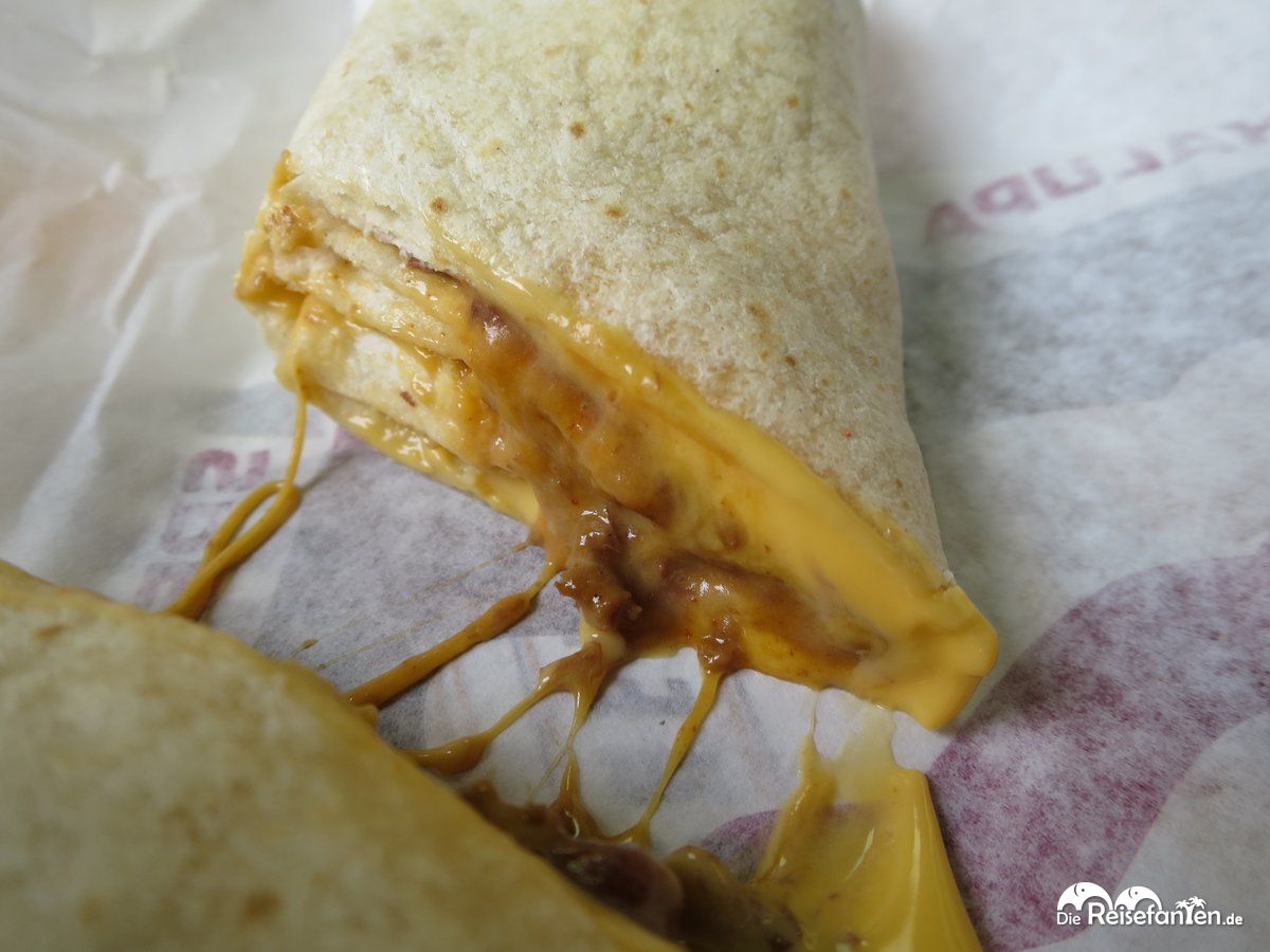 Bei Taco Bell werden mexikanische Gerichte serviert, vornehmlich sind dies Tacos, Burritos und Quesadillas. Mit einem Filialnetz, das alleine in den USA ungefähr 5.800 Filialen umfasst, stößt man praktisch überall auf eine Taco Bell am Straßen- oder Highwayrand. Wir haben insgesamt zwei Mal während unseres USA Roadtrips einen Abstecher hierhin gemacht und es hat uns wirklich gut geschmeckt. Zu den leckeren, teils etwas käselastigen Speisen gibt es eine Auswahl an milden und scharfen Soßen, dazu auf Anfrage auch die Devil’s Sauce, ein besonders scharfer Ableger. Ja, diese hatte durchaus einen gewissen Schärfegrad, aber seit unserem Thailand-Urlaub sind wir offen gestanden andere Schärfen im Essen gewohnt. Also alles noch im Rahmen bei Taco Bell.