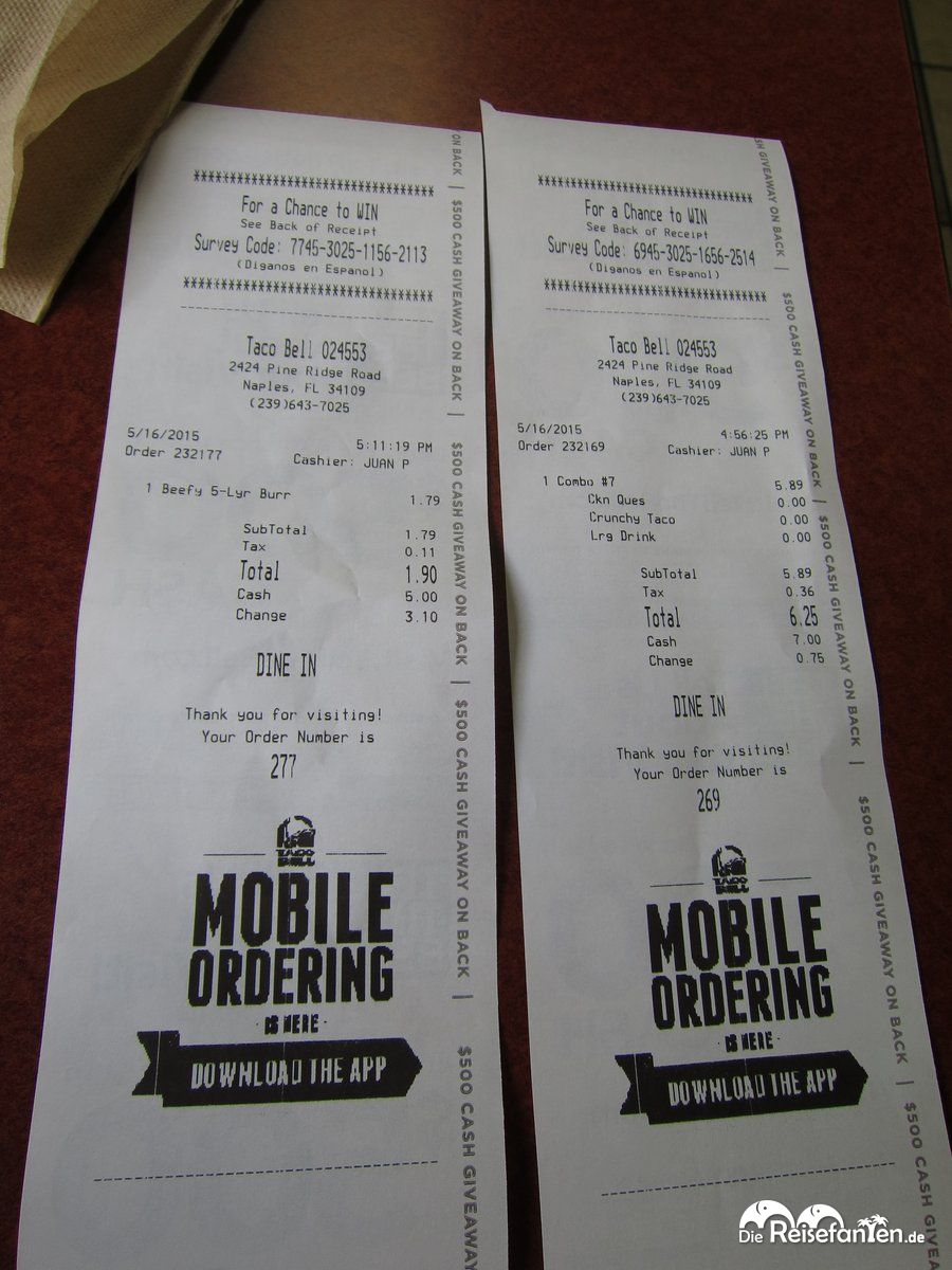 Für ein durchschnittliches Menü legt man bei Taco Bell um die 6 USD hin, natürlich immer zuzüglich Steuern, wie das in den USA so üblich ist. Satt wird man davon auf jeden Fall, allerdings schmeckt das Essen auch wirklich nach Fast Food, also ist nicht mit einem Essen beim Mexikaner Eures Vertrauens zu vergleichen. Lecker ist es dennoch, dazu gibt es den Refill an Getränken noch obendrauf. Uns hat es geschmeckt und auch gefallen.