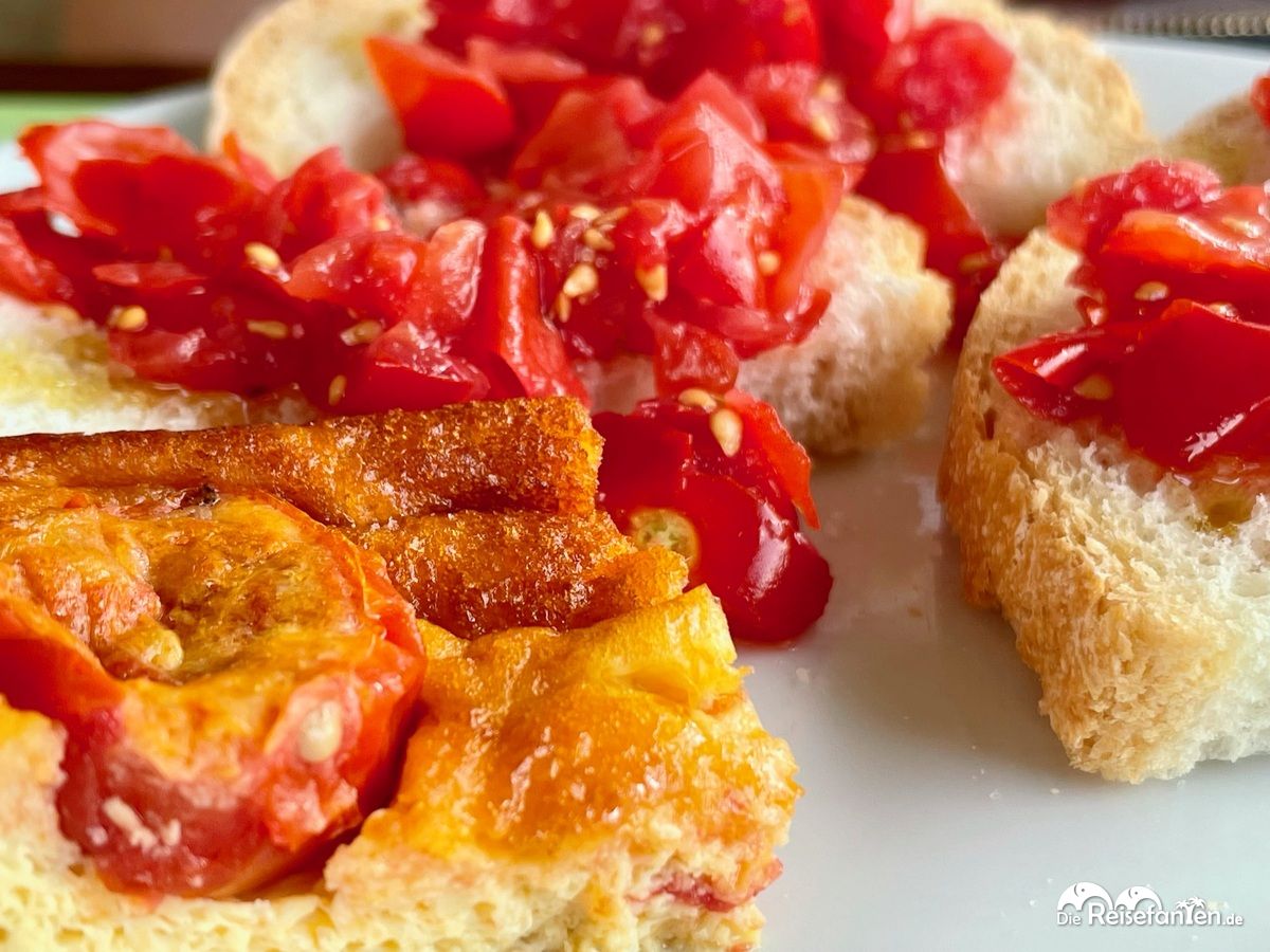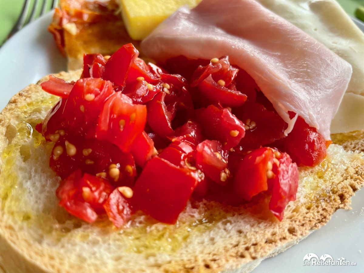Ein altes Sprichwort besagt ja: „Wo Licht ist, ist auch Schatten.“ Zum Glück gilt dies auch umgekehrt, denn das Frühstück im Ristorante agricolo Tenuta di Mensanello gehörte zu den besten, die wir bisher in Italien hatten. Das Vorgehen war dabei denkbar einfach: 3 Minuten von unserer Unterkunft in Richtung des Pools, ein paar Stufen herunter, ins Restaurant, Hände desinfizieren und Zimmernummer sagen, direkt die Getränke bestellen und einen Tisch aussuchen. Dann ging es schon los zum übersichtlich aussehenden, aber gut abgestimmten Buffet, das in einem separaten Raum aufgebaut und sogar mit einer  coronabedingten Laufrichtung versehen war (die aber von jedem ignoriert wurde). Dort erwarteten uns dann lokale Produkte, vornehmlich Tomaten, Olivenöl, eigenes Brot, diverse Marmeladen, Kuchen und jeden Tag eine andere Sorte Omelette-Stücke, mal mit Zucchini, mal mit Tomaten. Auch eine Station mit frischen Säften befand sich dort.