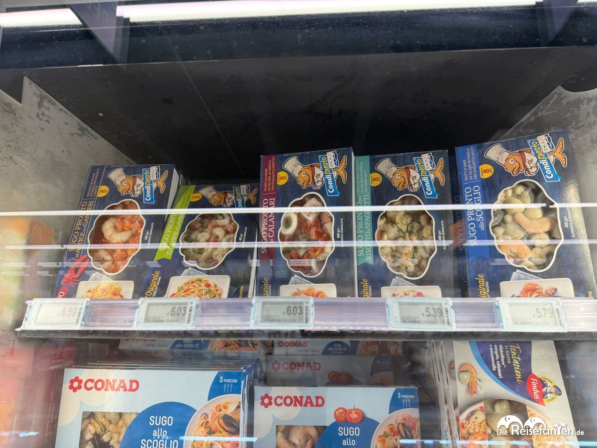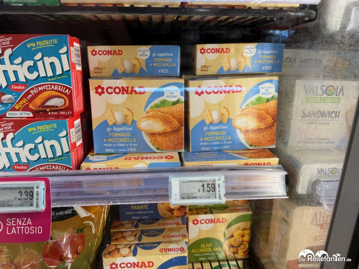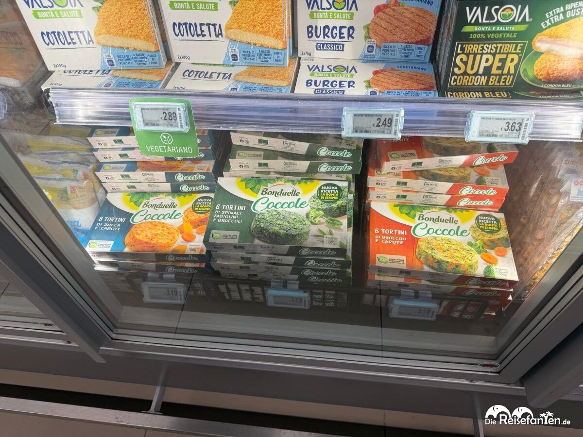 Auch im CONAD in Apulien (bei Nardò, nach unserem Mittagessen), zog es uns dabei auch Kühltheke. Da stapelten sich Fischnuggets für 2,79 €, Krabbensticks und Gratin für unter 4 € – deutlich günstiger als die 3–5 €, die ähnliche Produkte bei uns in Deutschland verlangen. Besonders die „Valsodia“-Burger und „Coccoli“-Taschen mit Käse oder Kartoffelfüllung faszinierten uns: italienisch gewürzt, knackig und ready-to-eat – wie eine Reise in die Trattoria, nur aus dem Gefrierschrank. Zumindest klangen die Produkte recht verheißungsvoll, auch wenn uns so Fast Food Essen eigentlich nicht zusagt. Es ist aber schon erstaunlich, wie verheißungsvoll die in Italien sein können.