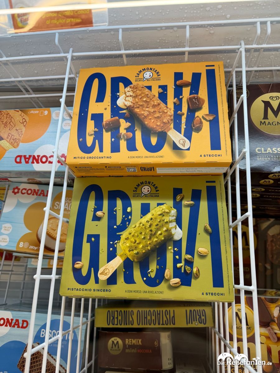 Unser absoluter Eis-Favorit in Italien? Das Gruvi Pistazieneis in grellgrünem Glanz – 4 Stiele für ca. 4 €! In Deutschland leider bisher noch nirgendwo gesehen, bzw. ist es einfach nicht erhältlich. Und das Pistazieneis in Deutschland schmeckt eh oft künstlich oder ist mit Vanille gestreckt → hier dagegen explodiert der pure Nussgeschmack. Kein Vergleich zu deutscher Markenware für 4–6 €, die dann einfach nicht authentisch schmeckt. Wir sind immer wieder neidisch.