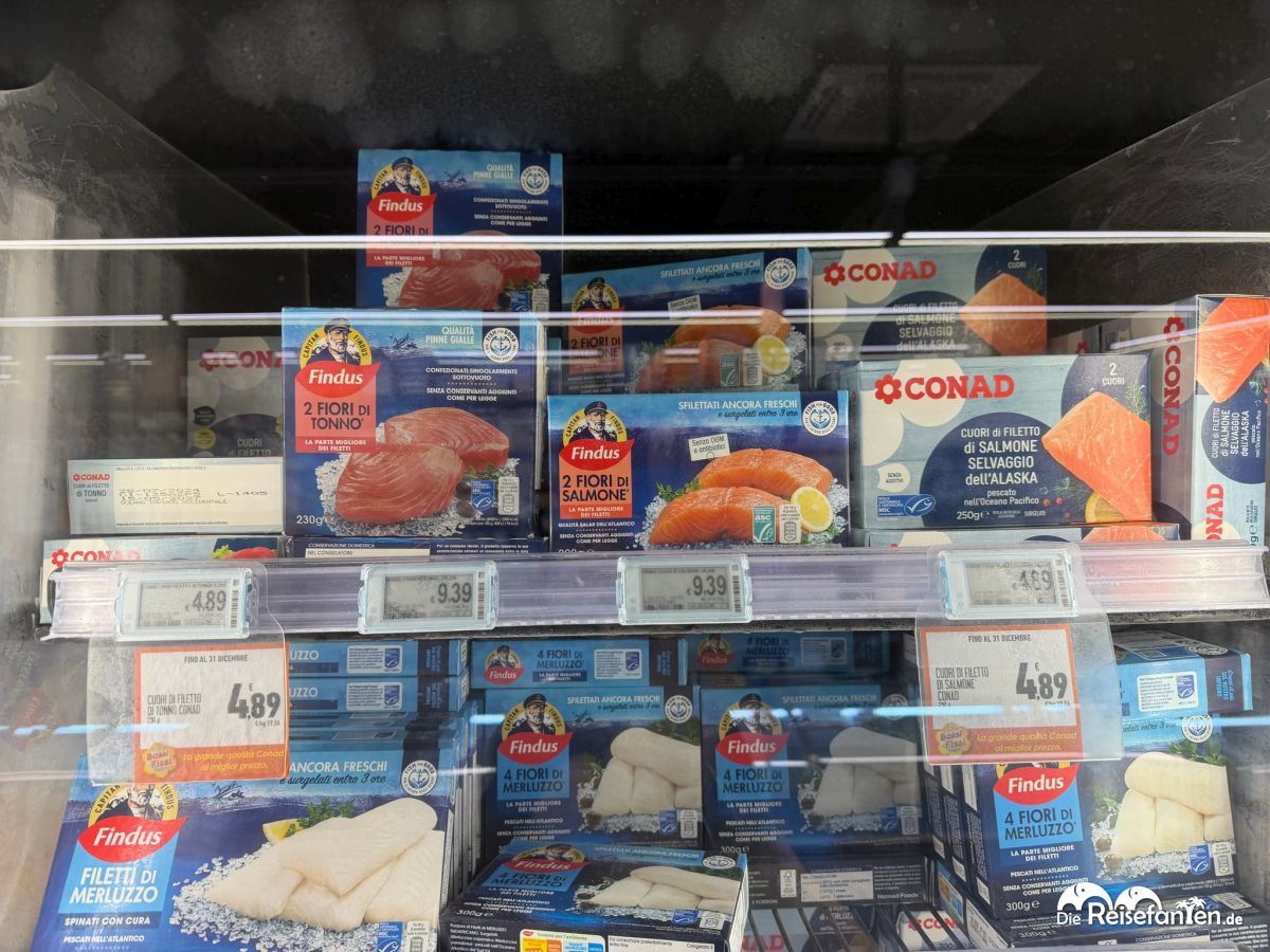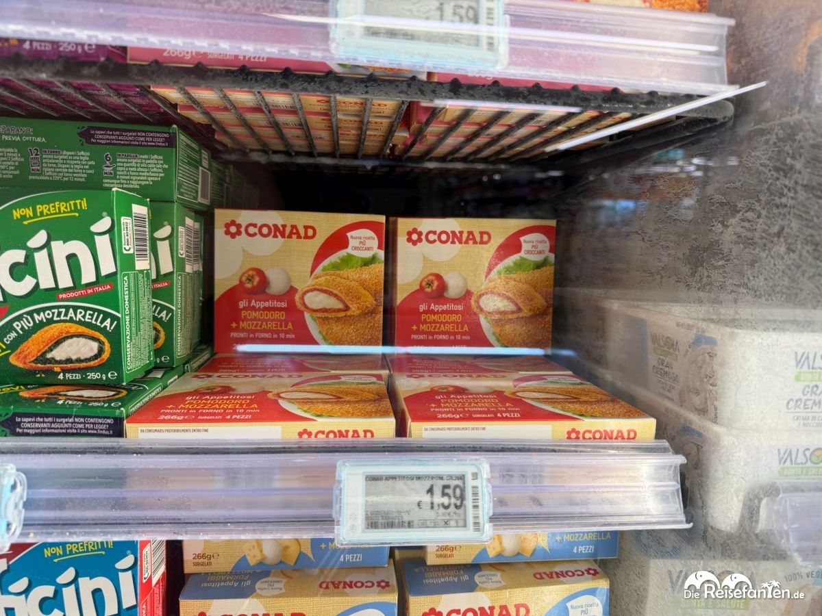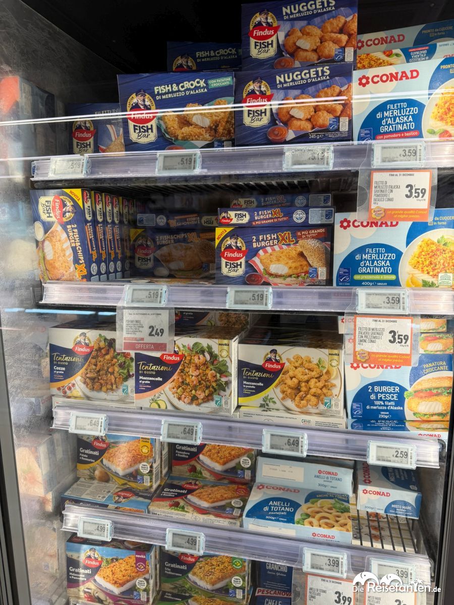 Auch im CONAD in Apulien (bei Nardò, nach unserem Mittagessen), zog es uns dabei auch Kühltheke. Da stapelten sich Fischnuggets für 2,79 €, Krabbensticks und Gratin für unter 4 € – deutlich günstiger als die 3–5 €, die ähnliche Produkte bei uns in Deutschland verlangen. Besonders die „Valsodia“-Burger und „Coccoli“-Taschen mit Käse oder Kartoffelfüllung faszinierten uns: italienisch gewürzt, knackig und ready-to-eat – wie eine Reise in die Trattoria, nur aus dem Gefrierschrank. Zumindest klangen die Produkte recht verheißungsvoll, auch wenn uns so Fast Food Essen eigentlich nicht zusagt. Es ist aber schon erstaunlich, wie verheißungsvoll die in Italien sein können.