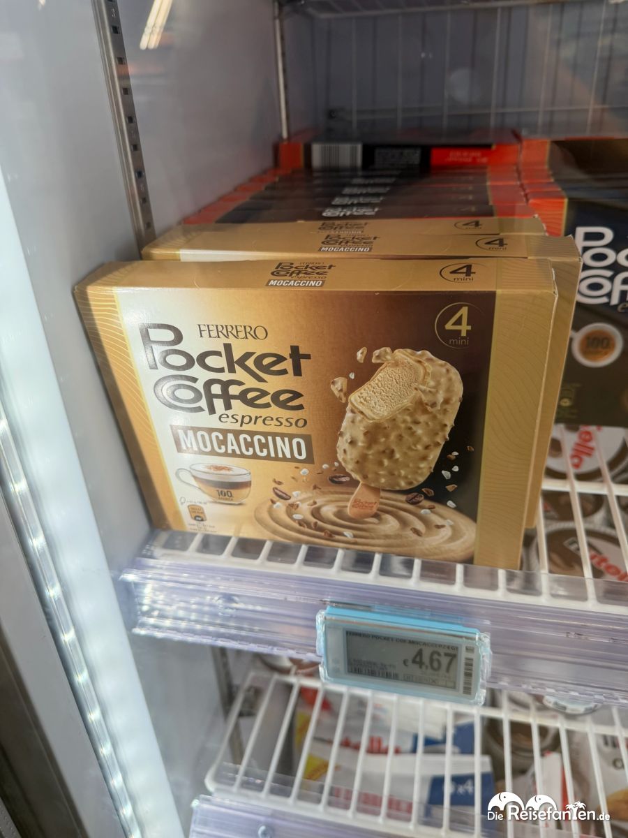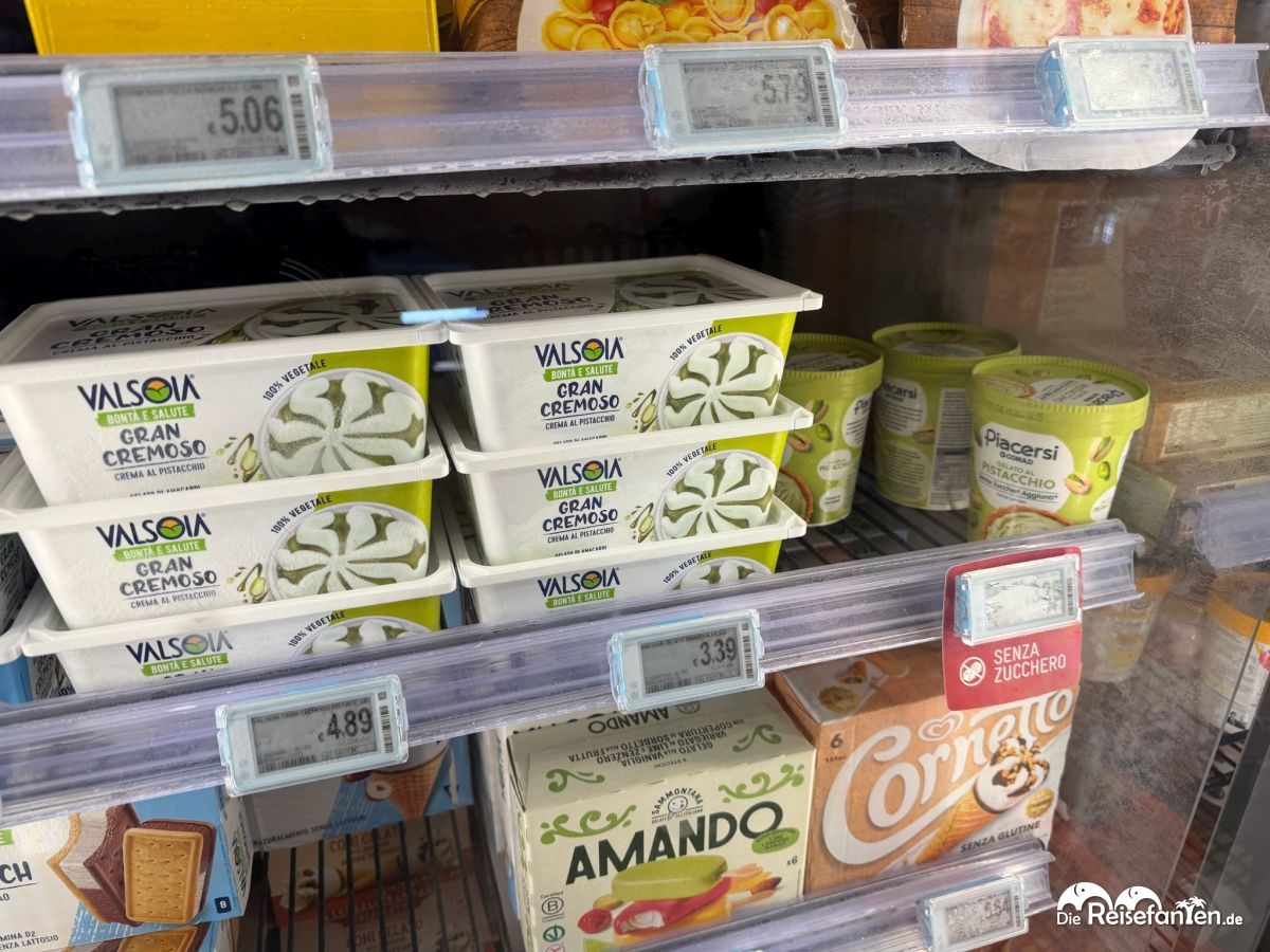 Unser absoluter Eis-Favorit in Italien? Das Gruvi Pistazieneis in grellgrünem Glanz – 4 Stiele für ca. 4 €! In Deutschland leider bisher noch nirgendwo gesehen, bzw. ist es einfach nicht erhältlich. Und das Pistazieneis in Deutschland schmeckt eh oft künstlich oder ist mit Vanille gestreckt → hier dagegen explodiert der pure Nussgeschmack. Kein Vergleich zu deutscher Markenware für 4–6 €, die dann einfach nicht authentisch schmeckt. Wir sind immer wieder neidisch.