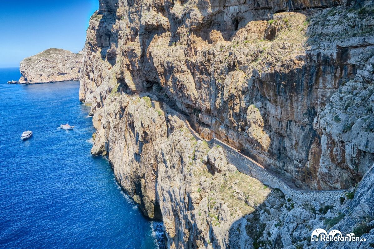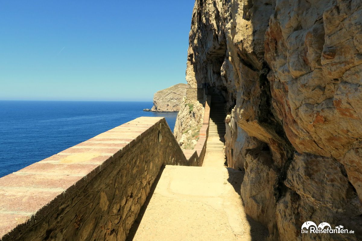 Ein Schild wies schließlich auf den Abstieg zur Grotta Di Nettuno hin und verriet zugleich die Eintrittspreise. Zur Besichtigung der Grotte sind wir jedoch nicht her gekommen, viel mehr waren wir auf den Abstieg über die Escala Di Cabirol gespannt. 654 Stufen sollen es sein, bis man die Grotta Di Nettuno erreicht. 654 Stufen, die sich wirklich gelohnt haben. Man hat einen großartigen Blick auf Capo Caccia, auf das Mittelmeer und auf den sagenhaften Abstieg – dass Menschenhand so etwas geschaffen hat ist fast unvorstellbar. Aber seht selbst: