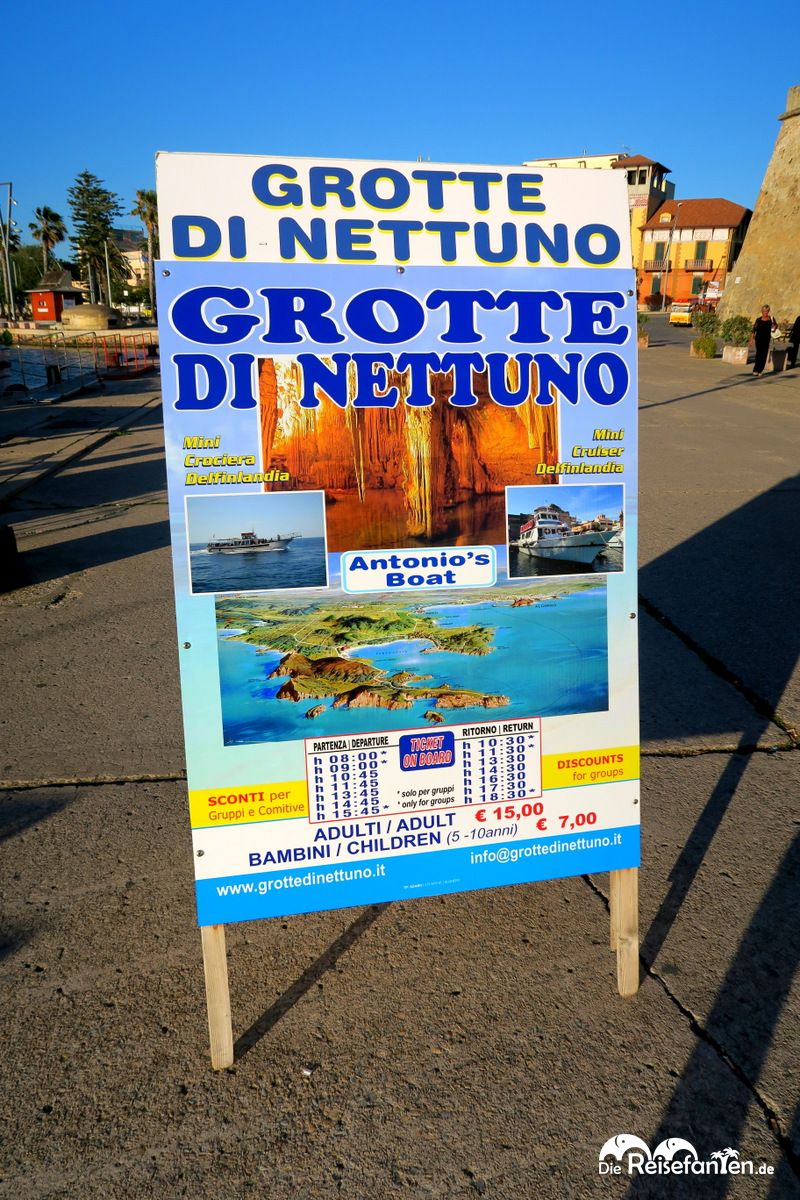 Unten angekommen kann man aber auch als nicht zahlender Gast einen Blick in die Grotta Di Nettuno werfen. Man vermutet, dass die Grotte ein Ausmaß von 4 Kilometern haben soll, wobei nur ein kleiner Bereich im Rahmen einer Führung zugänglich ist. Die Grotte befindet sich gerade einmal einen Meter über dem Meeresspiegel, so dass sie nur bei ruhiger See besichtigt werden kann.