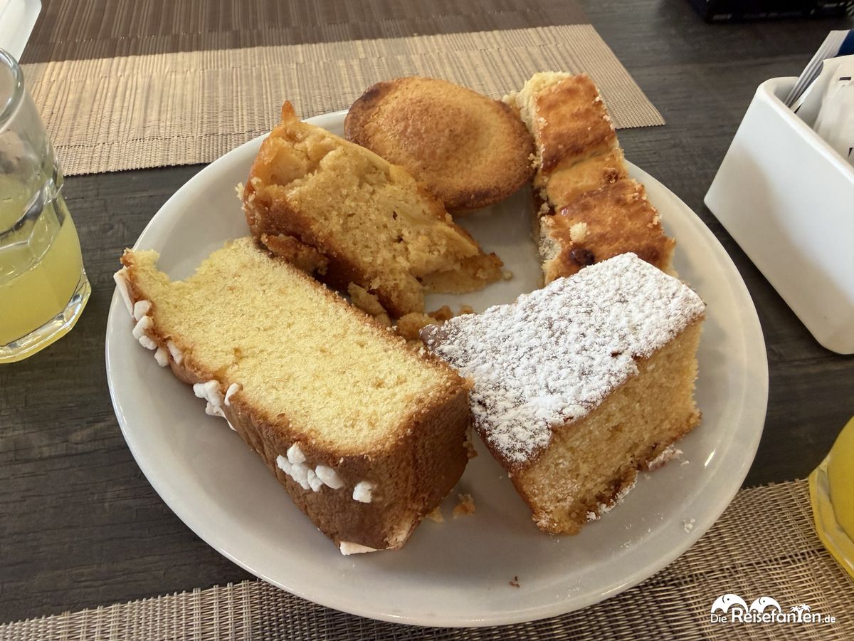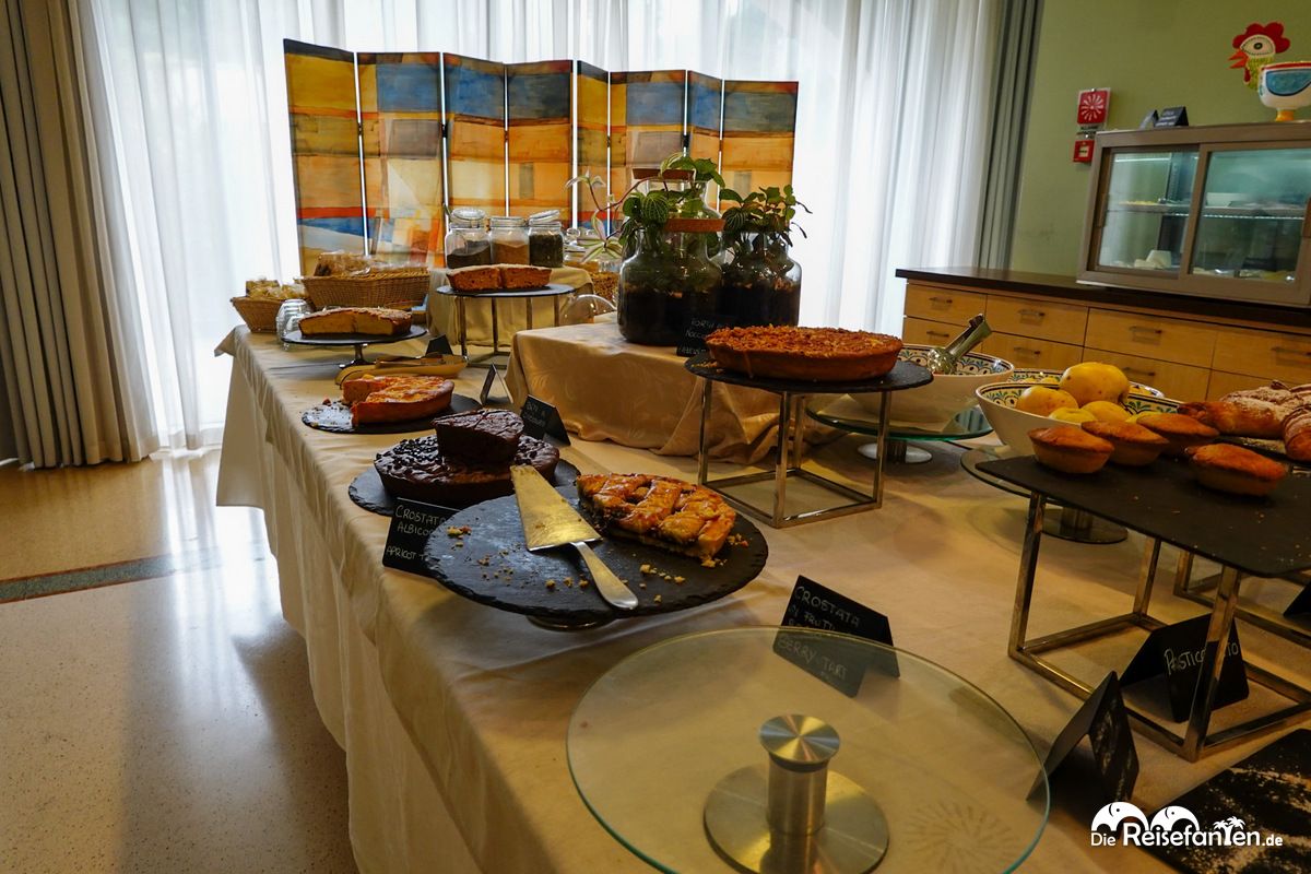 Das Frühstück bis 10:30 Uhr blieb trotzdem ein Highlight. Auch im Hotel Vittoria gab es für italienische Verhältnisse eine sehr große Auswahl: Ei, Gemüse, Croissants, Joghurt, frisches Obst und eine große Kuchenauswahl standen bereit. Dazu gab es einen Kaffeeautomaten. Gut gestärkt starteten wir in den Tag!