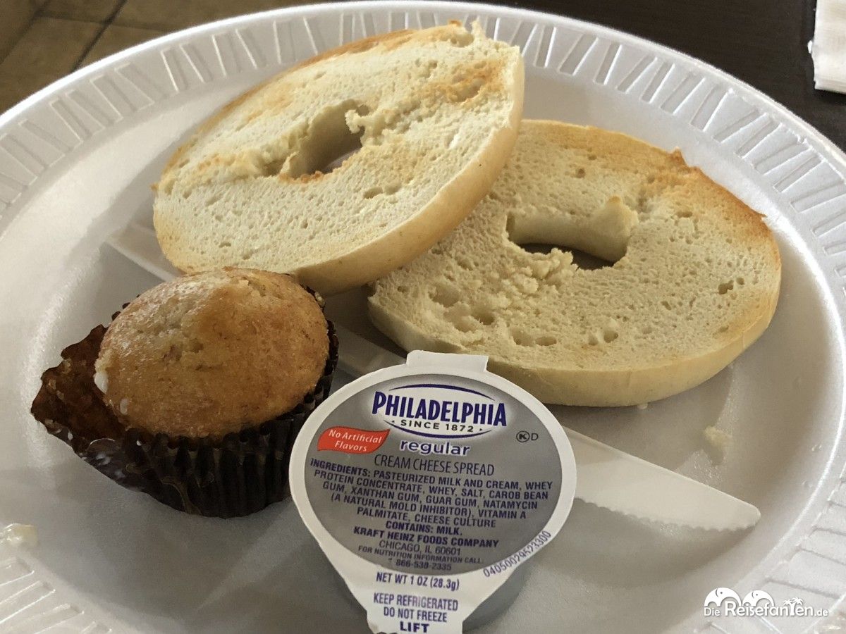 Am Morgen wird ein kleines Frühstücksbuffet hergerichtet und zu unserer Freude gab es nochmal Bagels. Kleine Muffins rundeten das Frühstück ab. Das Frühstück ist übrigens im Zimmerpreis enthalten und war für dieses Übernachtungshotel vollkommen in Ordnung.