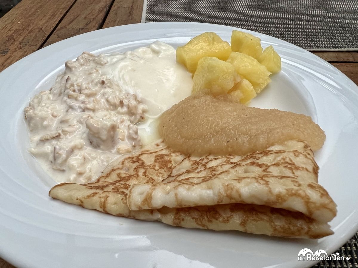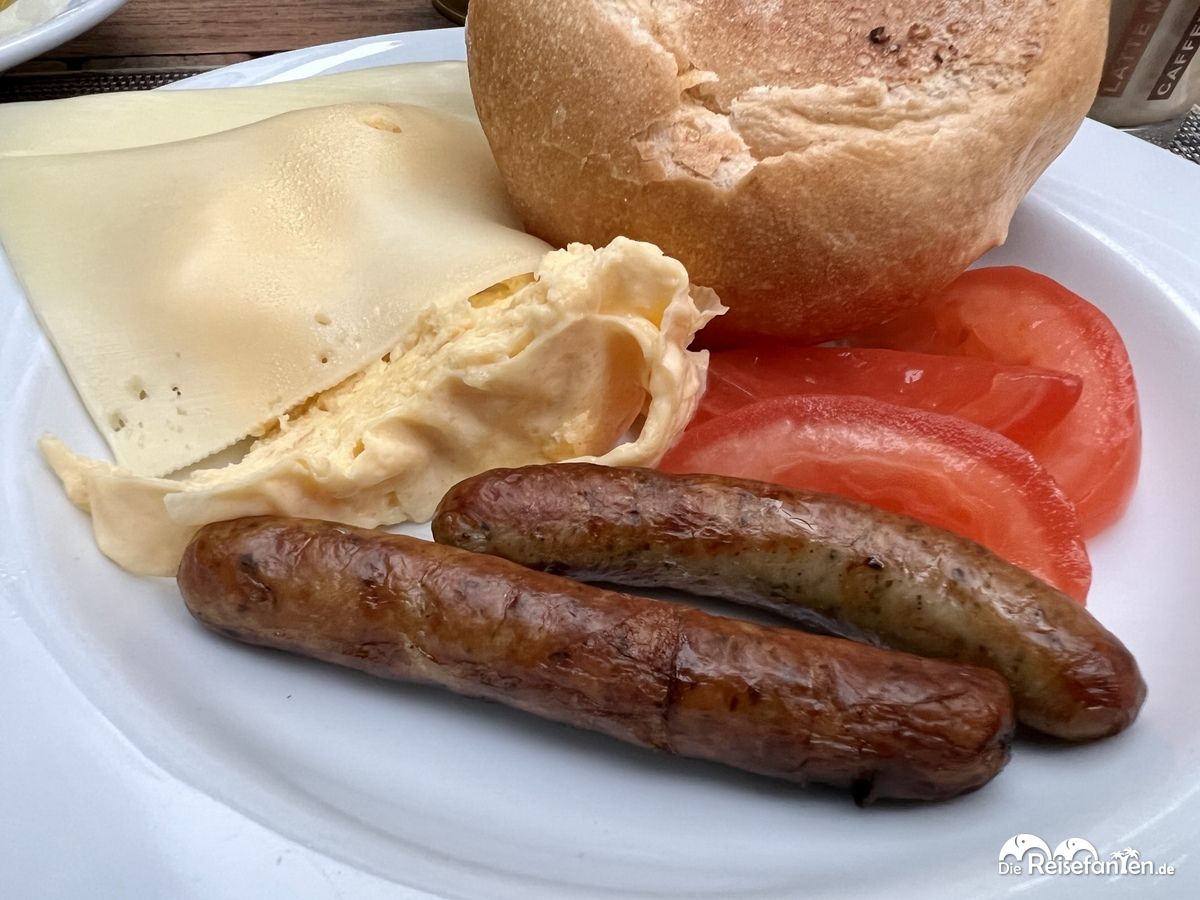 Am nächsten Morgen dann stand das Frühstück an, welches im Erdgeschoss serviert wurde. Es gab ein gutes Angebot an Backwaren, diverse herzhafte Speisen wie Würstchen, Frikadellen oder auch Speck. Dazu in einer sehr großen Pfanne frisches Rührei, was auch tatsächlich sehr gut schmeckte. Eine Besonderheit: es gab frische Pfannkuchen, die ebenfalls in einem Warmhalte-Behältnis aufbewahrt wurden. Dazu frisches Apfelmus und überhaupt noch neben einer Käse- und Wurstauswahl auch Angebote wie Birchermüsli, diverse Joghurts und Cerealien. Leider waren die Gefäße (bis auf die warmen Speisen) alle unverschlossen und ohne Spritzschutz, was uns als nicht sonderlich hygienisch erschien. Orangensaft gab es zum Selberzapfen, diverse Kaffeespezialitäten ebenfalls am Automaten. Platz nehmen konnten wir dann entweder im (eher sehr vollen) Innenbereich oder auch außen im großzügigen, überdachten Terrassenbereich. Wir entschieden uns für letzteren.