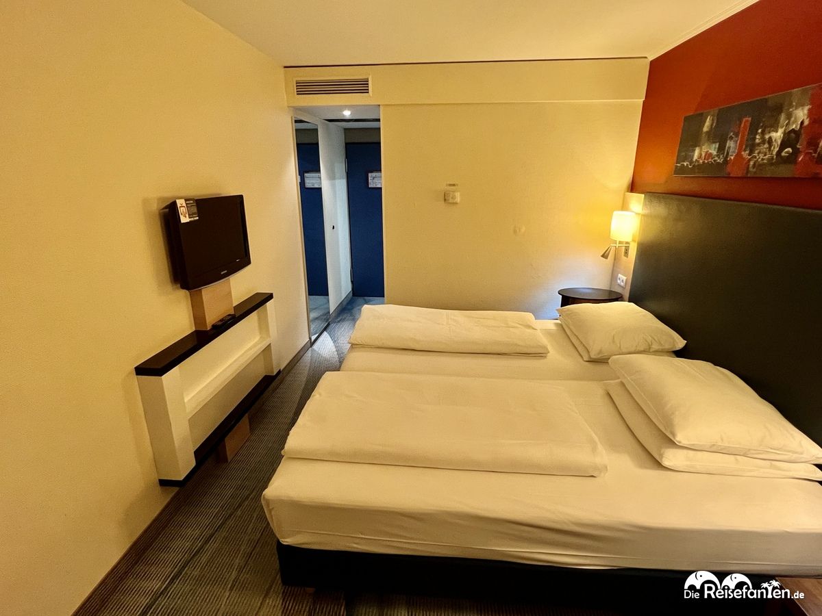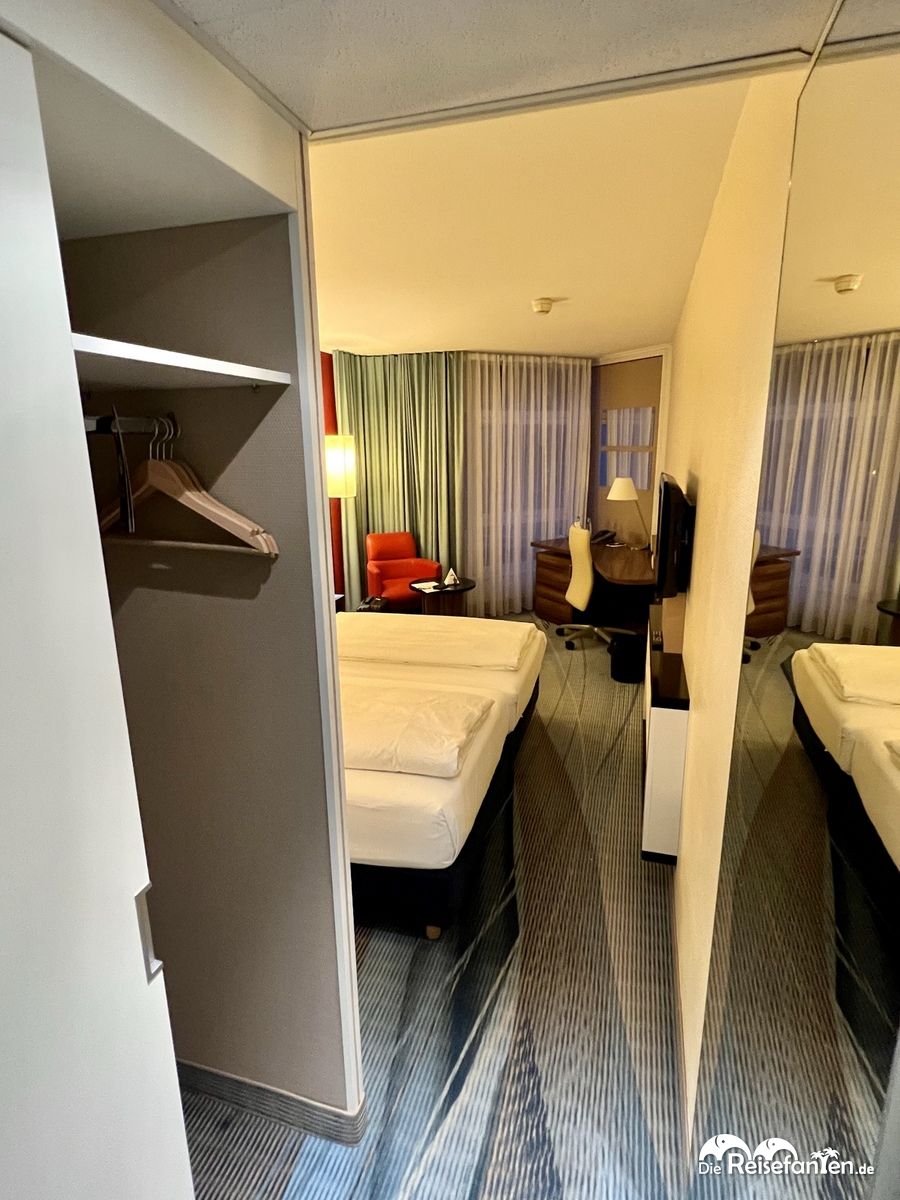 Der Check-in verlief recht einfach, schon nach wenigen Minuten erhielten wir vom freundlichen Rezeptionisten die kontaktlose Zimmerkarte, mit der sich dann die Tür im ersten Stock öffnen dies. Uns erwartete ein mittelmäßig geräumiges Zimmer, was aber alles hatte, was man sich so wünscht. Auffällig war, dass es eine kleine Schreibtisch-Ecke gab – nur der dortige Schrank, der so aussah, als beherbergte er noch eine Minibar oder einen Kühlschrank, erwies sich dann doch nur als reiner Schrank. 😉 Das drückte den Eindruck aber nicht. Das Badezimmer war sauber, in schlicht-grauer Optik gehalten und eher funktional, der Föhn zudem stärker, als er auf den Bildern den Eindruck macht.