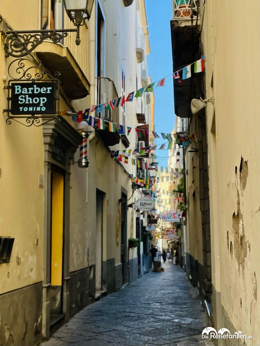 Anschließend ging es ohne Stopp weiter durch die Gassen von Sorrento zu einem Möbel- und Keramikladen. Hergestellt und vertrieben werden dort für die Region typische Holzarbeiten. Für uns war dies der uninteressanteste Stopp des Ausflugs. Da wir uns nicht von der Gruppe entfernen durften, schlenderten wir zwangsläufig einmal kurz durch den Laden und warteten dann am Ausgang. Solche aufgezwungen Verkaufsveranstaltungen entsprechen eher nicht unserem Geschmack.