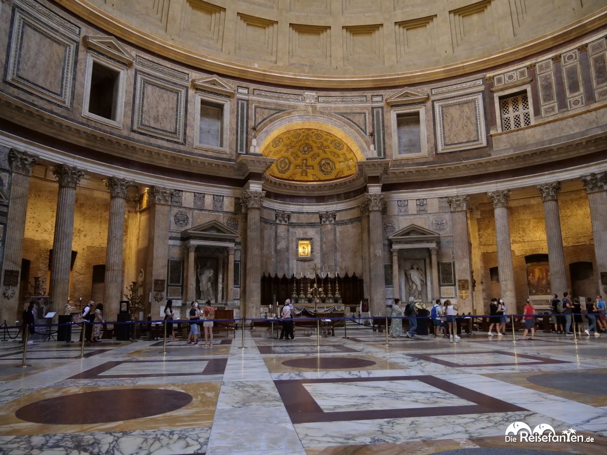 Alleine der Eingang des Pantheons ist mit seinen sechzehn agyptischen Granitsäulen zu je 14 Metern Höhe beeindruckend, der Innenraum mit dem Himmelsloch von 9 Metern Durchmesser in der Kuppel nicht weniger. Im Pantheon stehen dann im Kreis die sieben Gottheiten Sonne, Mond, Venus, Saturn, Jupiter, Merkur und Mars – jeweils stellvertretend für die Himmelskörper. Übrigens ist das Pantheon am Boden leicht gewölbt, so dass hereinfallendes Regenwasser ablaufen kann.