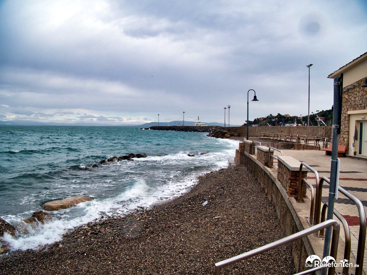 Von dort aus ging es dann zur Uferpromenade. Bereits zu Beginn fanden wir eine ungewöhnliche Tafel vor, die mittels QR-Codes die verschiedenen Strände rund um die Halbinsel Monte Argentario am Südrand der Toskana zeigte und beschrieb. Eine pfiffige Idee, das so interaktiv zu kommunizieren. Weiter ging es dann – analog zum sich verstärkenden Regen – entlang der Hafenpromenade, die von schönen Palmen gesäumt war und an die das etwas aufgewühlte Mittelmeer brandete.