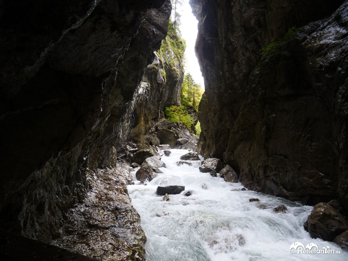 Die Partnachklamm war nicht nur eng, unzugänglich und schroff – stellenweise war es aufgrund des tosenden Wassers auch sehr laut. Kaum vorstellbar, dass hier nicht nur Holz hindurch transportiert, sondern auch Arbeiter auf wackeligen Stühlen herabgelassen wurden, um verkeilte Baumstämme wieder gangbar zu machen. Wir waren jedenfalls nachhaltig beeindruckt und haben noch einige weitere Bilder im Gepäck aus dem Herzen dieses Naturschauspiels in Bayern.