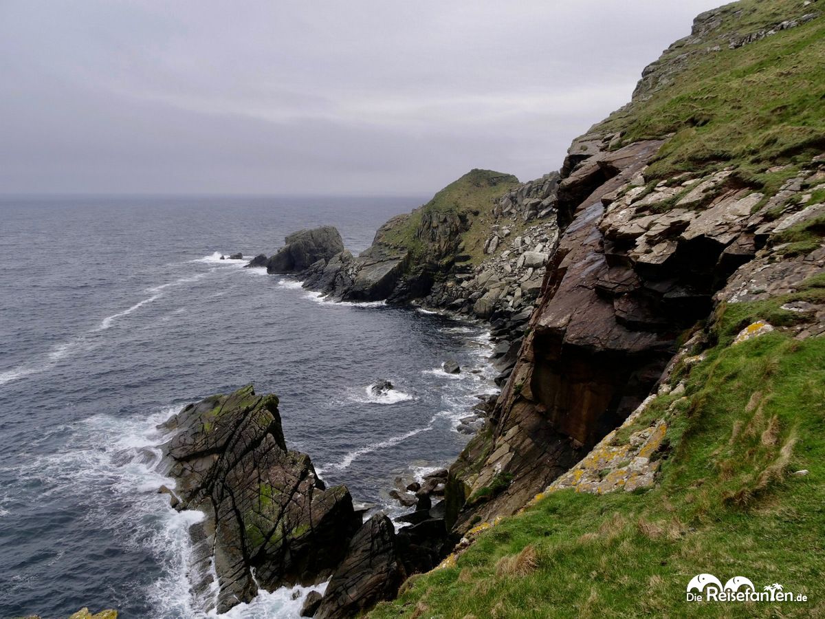 Anschließend ging es weiter Richtung Klippen, dem Ness of Sound, einer Halbinsel. Eine Karte gab einen Überblick über die Wege. Wobei man Wege eigentlich in Klammern setzen müsste, wir gingen praktisch einen Deich entlang, vorbei an Schafen und zahlreichen Tretminen. 🙂 Bei Regen sollte man es sich gut überlegen, ob man diesen Weg wählt, da dieser recht matschig werden könnte. Es ist nun mal ein Naturwanderweg. Wir fanden es toll, direkt in der Natur zu sein und diesen wahnsinnig grünen Deich entlang zu laufen. Der Rundweg war gut zu meistern und es boten sich tolle Fotoperspektiven.