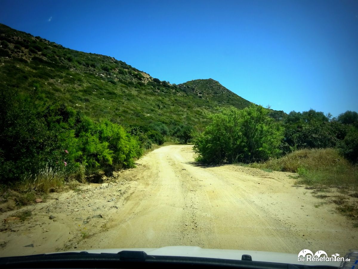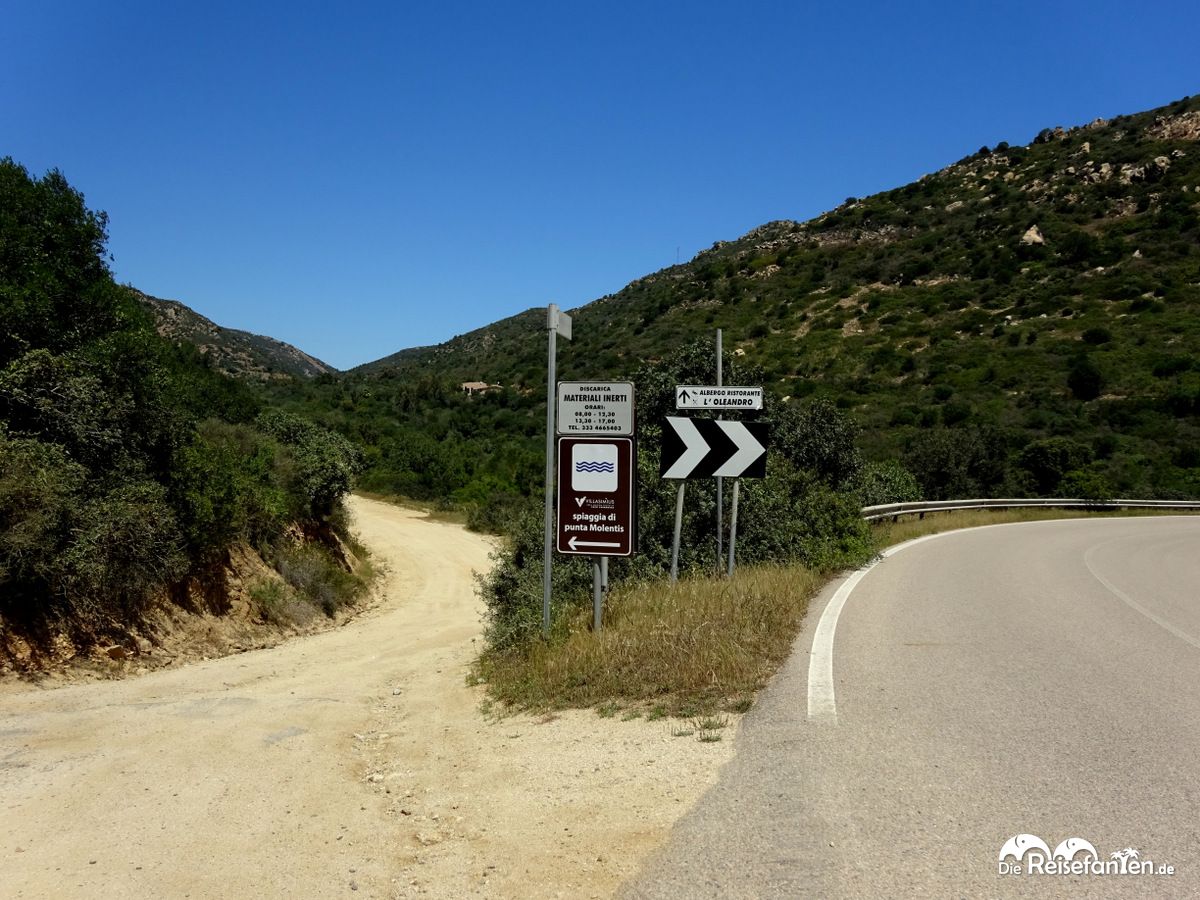 Zu erreichen ist die Spiaggia di Punta Molentis über die Küstenstraße, die ein tolles Panorama bietet. Man sollte sich nicht nur auf das Navi verlassen, sondern ebenfalls auf die Schilder achten, denn die letzten Meter müssen auf einen unbefestigten Weg mit vielen Schlaglöchern zurück gelegt werden, diese Schilder weisen aber den Weg. Die Anzahl der Parkplätze hält sich im Rahmen und dürfte in der Hauptsaison nicht ausreichend sein. Eine frühe Ankunft in der Saison ist daher sicherlich empfehlenswert. Wir hatten im Mai keine Probleme, kostenpflichtig war der Parkplatz zudem nicht. Aber auch das kann in der Hauptsaison ganz anders aussehen.