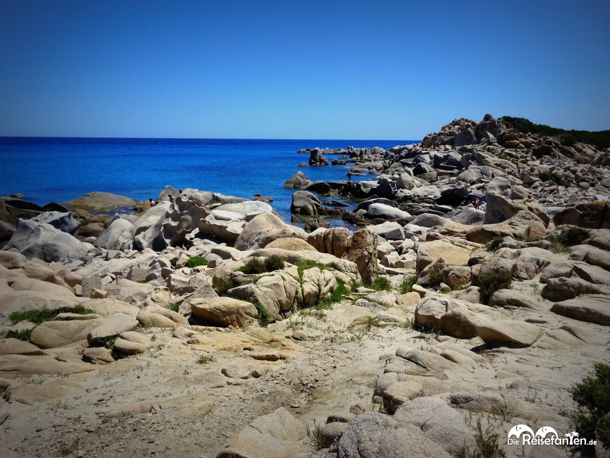 Vom Parkplatz sind es dann noch 5 Gehminuten und dann ist man da, in der Karibik und doch auf Sardinien. Der sehr feine weiße Sandstrand und das klare türkisfarbene Wasser ist zurecht bei den Urlaubern sehr beliebt. Der Strand ist zweigeteilt: auf der rechten Seite der besagte Sandstrand, auf der linken Seite Granitfelsen, die zum Schnorcheln einladen. Am Sandstrand werden im Sommer anscheinend Hotelliegen aufgestellt, ein Schild deutete bereits an, dass der Bereich nur Hotelgästen zur Verfügung stehe.