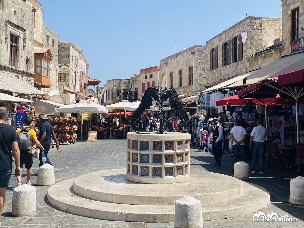 Vor dem Großmeisterpalast verläuft die Rittergasse Odos Ippoton. Eine alte Kopfsteinpflasterstraße, recht uneben, wie sie aus einer Folge von Game of Thrones entnommen sein könnte. Gedreht wurde hier aber nicht. Vielmehr befinden sich in der Rittergasse frühere Ritterunterkünfte. Heutzutage erinnern Ritterrüstungen und Souvenirgeschäfte daran. Und eben das besagte Kopfsteinpflaster.