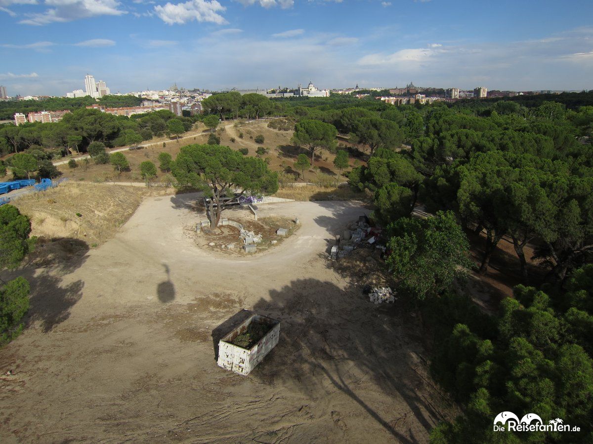 Der Weg verläuft übrigens von der Paseo del Pintor Rosales zur Casa de Campo, mitten im großen innerstädtischen Park von Madrid. Auf dem Weg dorthin lässt sich zum Einen das schöne Panorama genießen, allerdings auch so manche nicht ganz so prickelnde Aussicht. Da werden einmal die Müllsammelstellen im Casa de Campo überflogen. Ein anderes Mal gondelt man gemächlich an großen Wohnblöcken vorbei, die über die Scharen an vorbeibahnenden Touristen wohl eher weniger erfreut sein dürften – gewährt die Höhe und Nähe zu diesen Häusern doch theoretisch etwas indiskrete Blicke in die Wohnungen.