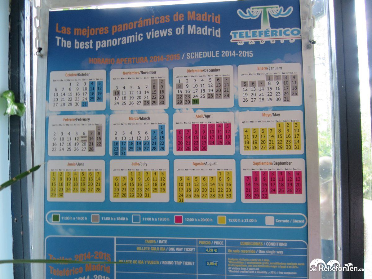 Preislich bewegt sich die Teleférico de Madrid noch voll im Rahmen. 4.20 € kostete eine Richtung noch im Sommer 2015, für das Kombiticket für Hin- und Rückfahrt wurden schlappe 5.90 € fällig. Zu beachten sind auf jeden Fall die recht unterschiedlichen Öffnungszeiten, die jedoch auf den bunten Übersichts- und Tariftafeln gut verständlich aufgelistet sind.