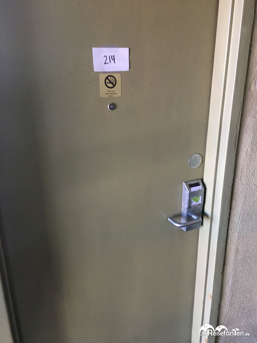 Ein guter erster Eindruck sieht anders aus, dennoch war das Zimmer in Ordnung und vor allem eins: es war sauber. Das von uns gebuchte Doppelzimmer der Magic Carpet Lodge war sehr einfach eingerichtet aber wir suchten in Seaside vor allem einen Schlafplatz, bevor es am nächsten Tag den Pacific One entlang gehen sollte. Diesen Schlafplatz fanden wir in der Magic Carpet Lodge. Allerdings kann man dem obigen Bild entnehmen, dass die Zimmertür nicht komplett zu schließen war – es blieb ein Spalt. Dadurch zog es während unserer Übernachtung Ende September in unserem Zimmer, so dass wir eine sehr kühle Nacht in der Magic Carpet Lodge verbrachten.