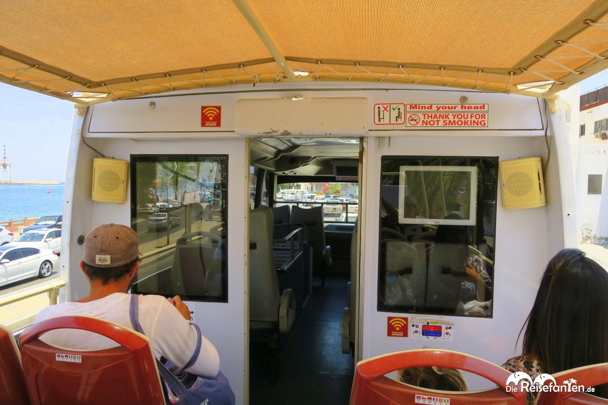 Nachdem wir durch den Mutrah Souq geschlendert sind, ging es aber auch los mit dem Big Bus. Die Haltestelle am Souq ist zudem die erste auf der Tour, was jedoch nicht bedeutet, dass man hier starten muss. Die modernen Doppeldeckerbusse sind zum Teil klimatisiert, bieten aber auch einen offenen Teil im oberen Bereich. Da wir während der Fahrt fotografieren wollten, wählten wir den offenen Bereich. Für die vielen Informationen während der Fahrt haben wir im Vorfeld Kopfhörer erhalten, die gewünschte Sprache kann dann am Platz eingestellt werden. Ausgestattet mit einer kalten Wasserflasche, die es ebenfalls beim Einstieg gab, nahmen wir also Platz und die Tour konnte beginnen.