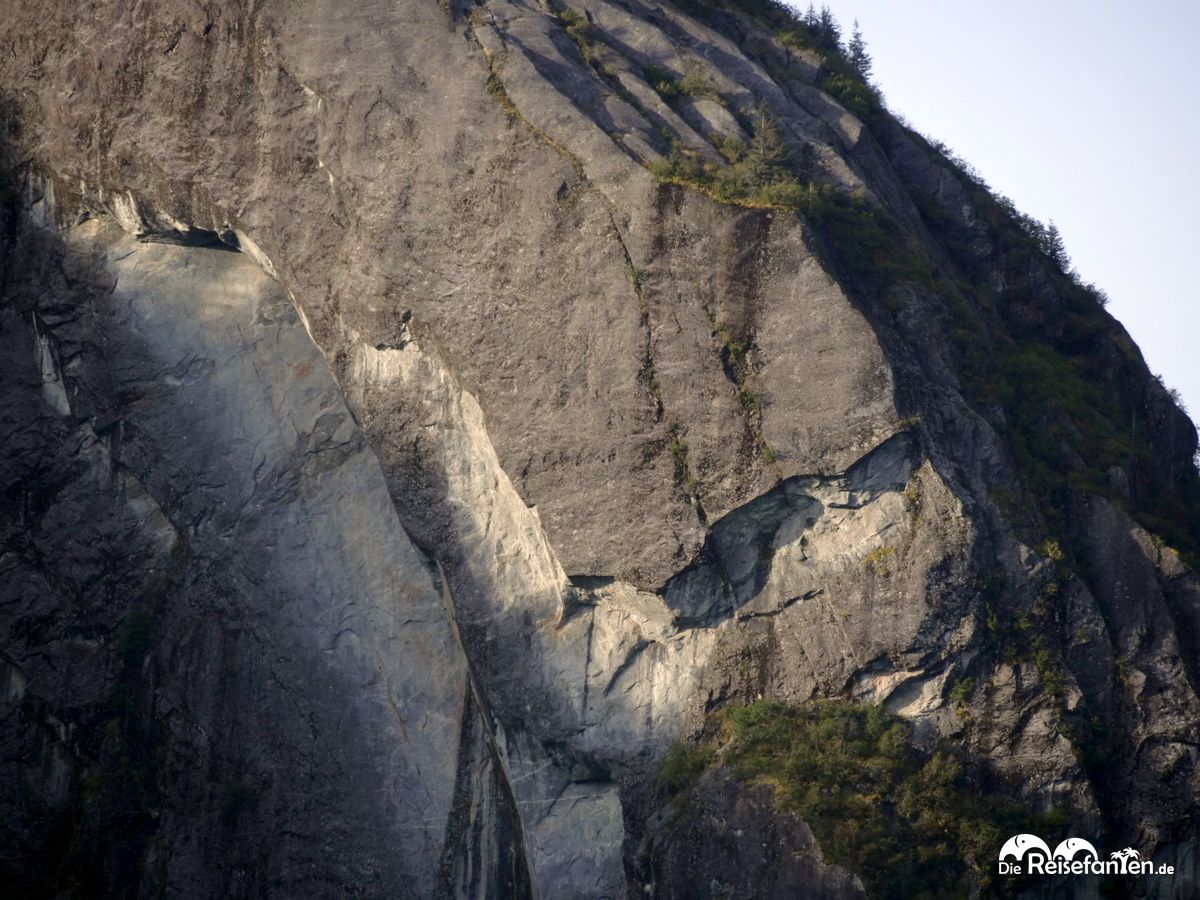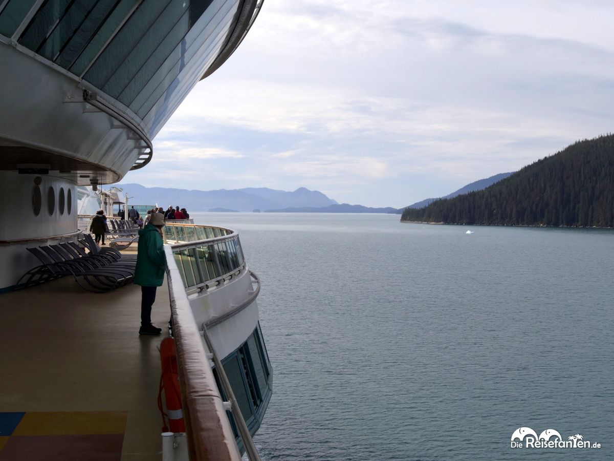Unsere heutige Route führte uns in bzw. durch den Tracy Arm Fjord, vorbei an majestätischen Bergen, die sich im meist glatten Wasser des Fjords schön widerspiegelten. Wir konnten uns kaum sattsehen an den schroffen Klippen und den Wasserfällen, die sich mal heimlich, mal offensichtlich in die Tiefe stürzten. Um die Größenverhältnisse, die bei solchen Naturaufnahmen immer untergehen, etwas transportieren zu können, haben wir übrigens auch ein paar Aufnahmen mit Mitreisenden im Anschnitt gemacht. Seht selbst: