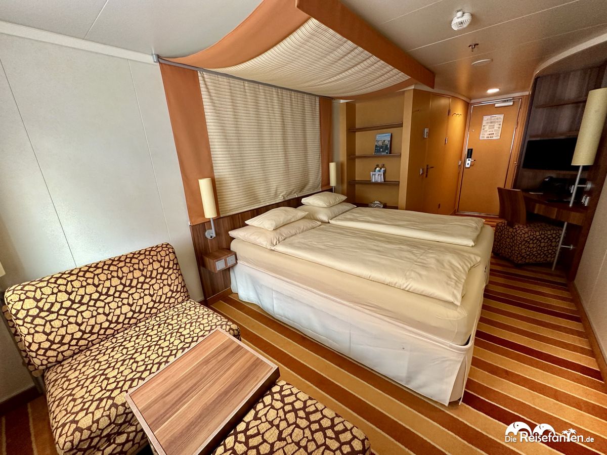 Gebucht hatten wir eine Außenkabine auf Deck 4, mittig. Die Kabine konnten wir direkt beziehen und auch mit den Koffern dauerte es nicht lange. Unsere Kabine war recht großzügig vom Platzangebot. Bei unserer letzten Fahrt mit der AIDAbella hatten wir eine Balkonkabine, die waren auf dieser Reise aber bereits alle ausgebucht. Da durch Covid die letzten Asienfahrten ausgefallen sind, war dies die erste Reise nach dem Ausbruch in 2020 und so gab es viele an Board, die mehrmals umgebucht haben. Wir waren daher froh, dass wir noch eine Außenkabine erwischt hatten.