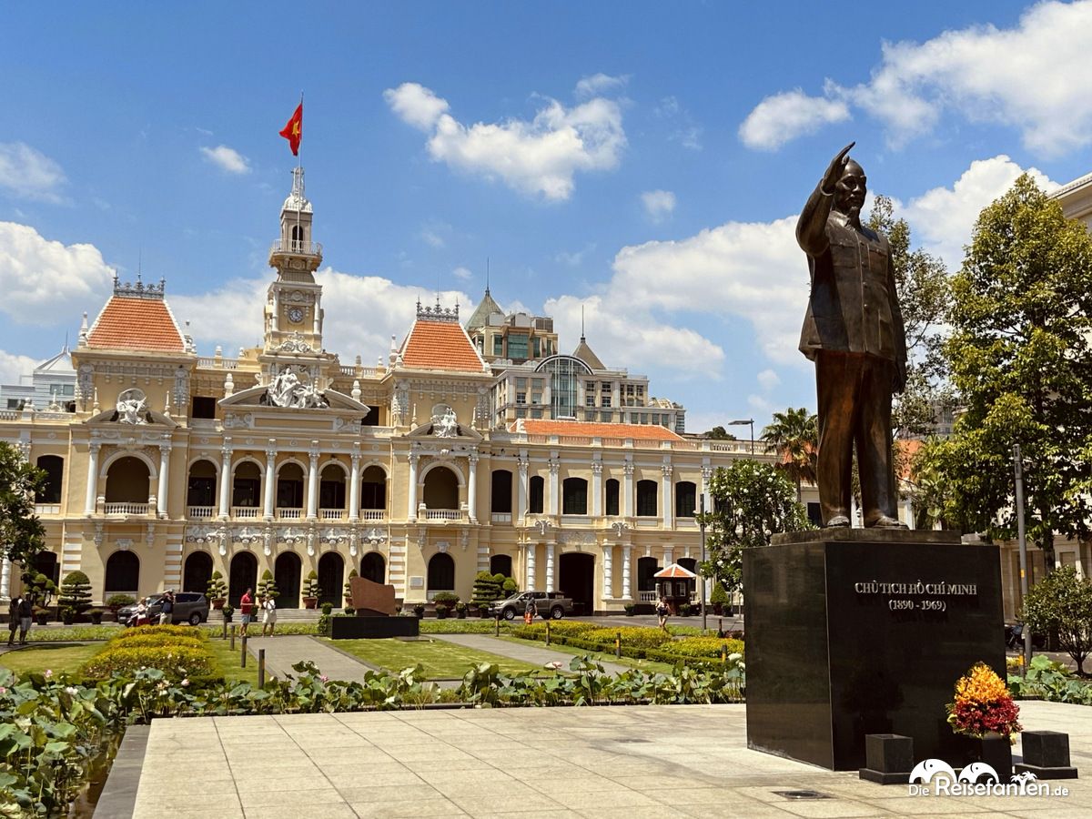 Wir gingen von dort in Richtung Rex Hotel und weiter zum Ho Chi Minh Denkmal. Wenn man es nicht besser wüsste, würde man beim Anblick der Straßenzüge denken, man sei in Beverly Hills oder in Miami. Meterhohe Palmen und moderne Wolkenkratzer mit Glasfassaden – das hätten wir in Ho Chi Minh in der Form nicht erwartet.