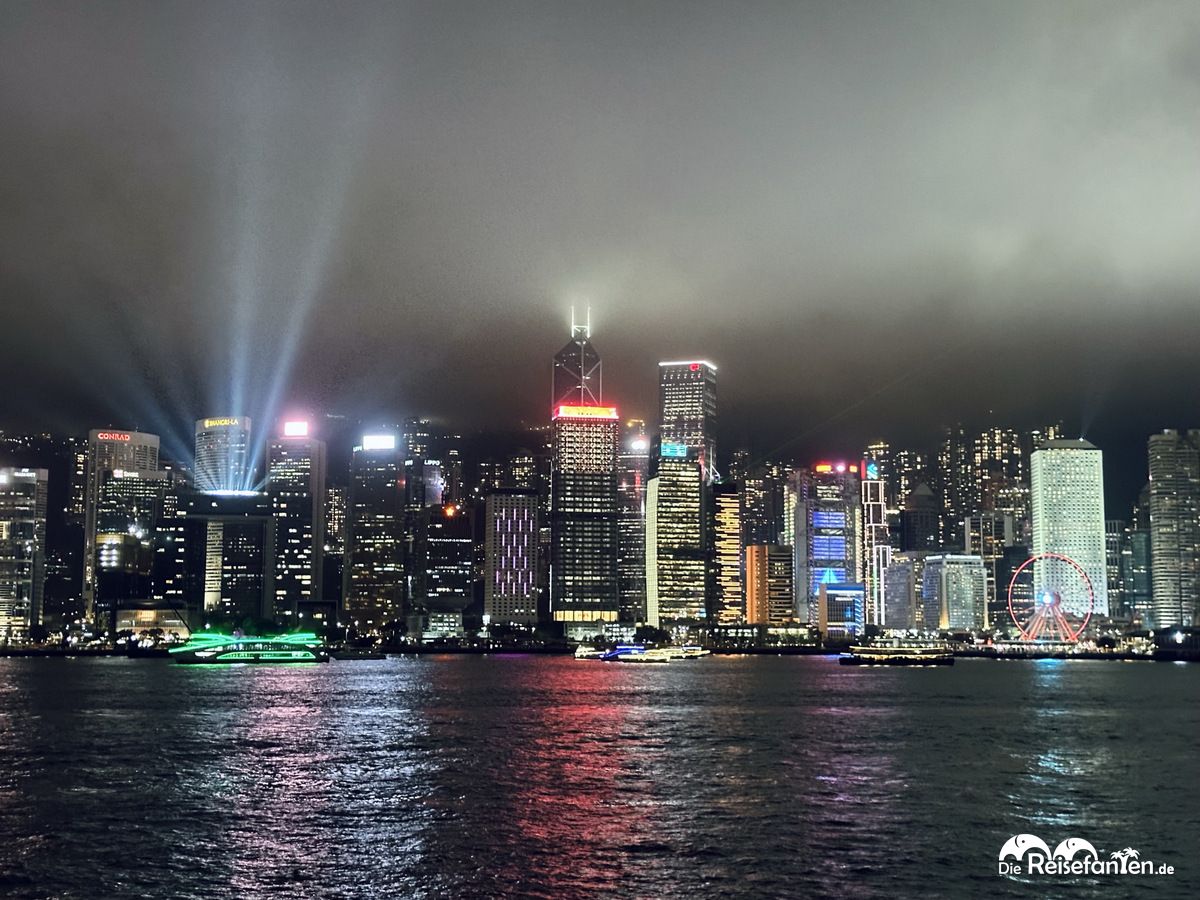 Nach unserer Pause war es bereits dunkel. Zwar immer noch neblig aber die Wolkenkratzer waren wahnsinnig cool beleuchtet. Täglich um 20h findet die 15minütige Show ‚The Symphony of Lights‘ statt. Dabei werden verschiedene Gebäude auf der anderen Flussseite (Hongkong Island) im Takt der Musik bunt angeleuchtet. Die beste Möglichkeit die Show zu erleben ist von der Promenade ‚Avenue of the Stars‘. Man sollte mindestens eine halbe Stunde früher da sein, um direkt vorne zu stehen. Die Show war sehr cool, die Musik eher asiatisch. Man sollte sich die Show aber nicht entgehen lassen.