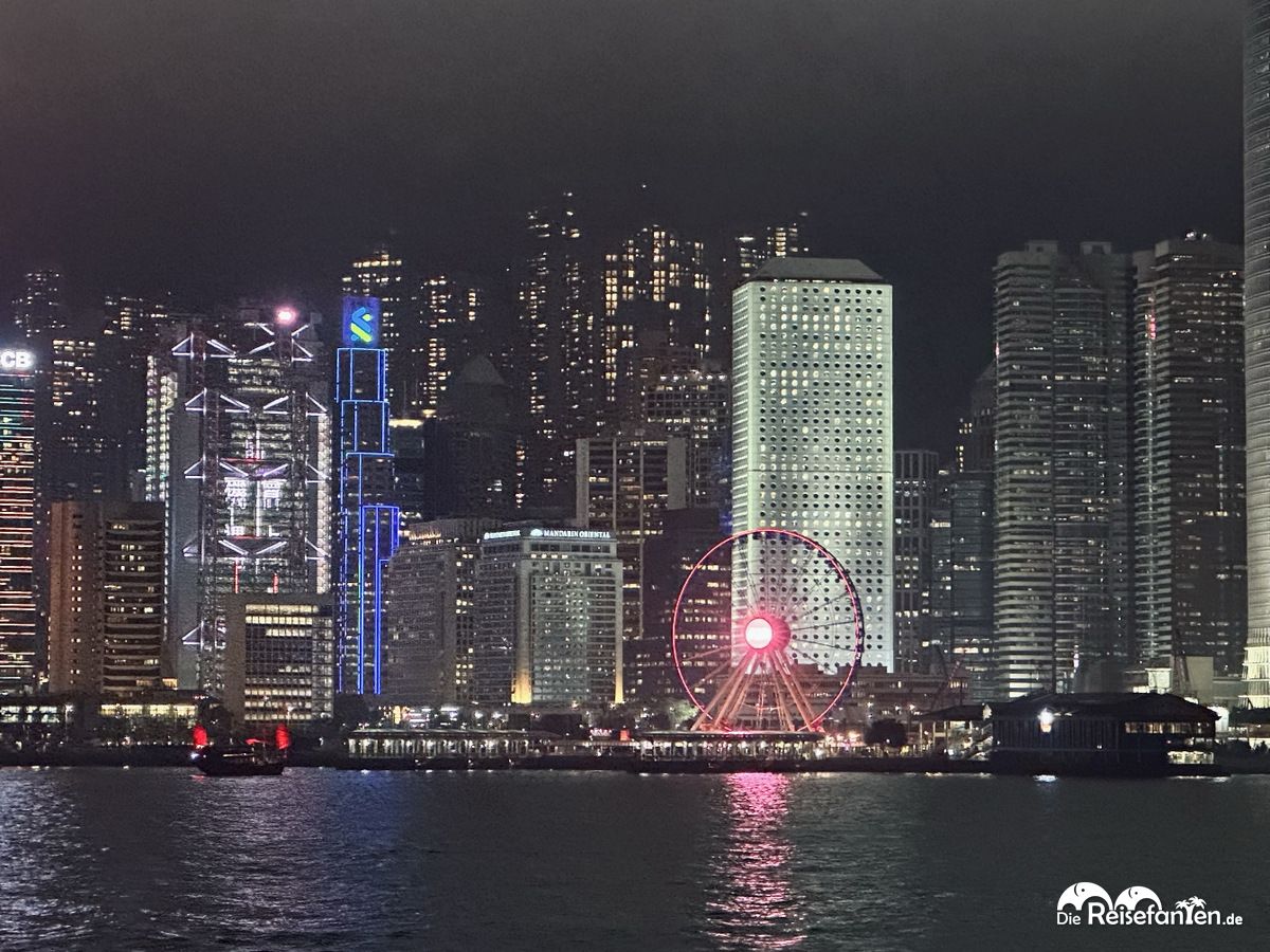 Nach unserer Pause war es bereits dunkel. Zwar immer noch neblig aber die Wolkenkratzer waren wahnsinnig cool beleuchtet. Täglich um 20h findet die 15minütige Show ‚The Symphony of Lights‘ statt. Dabei werden verschiedene Gebäude auf der anderen Flussseite (Hongkong Island) im Takt der Musik bunt angeleuchtet. Die beste Möglichkeit die Show zu erleben ist von der Promenade ‚Avenue of the Stars‘. Man sollte mindestens eine halbe Stunde früher da sein, um direkt vorne zu stehen. Die Show war sehr cool, die Musik eher asiatisch. Man sollte sich die Show aber nicht entgehen lassen.
